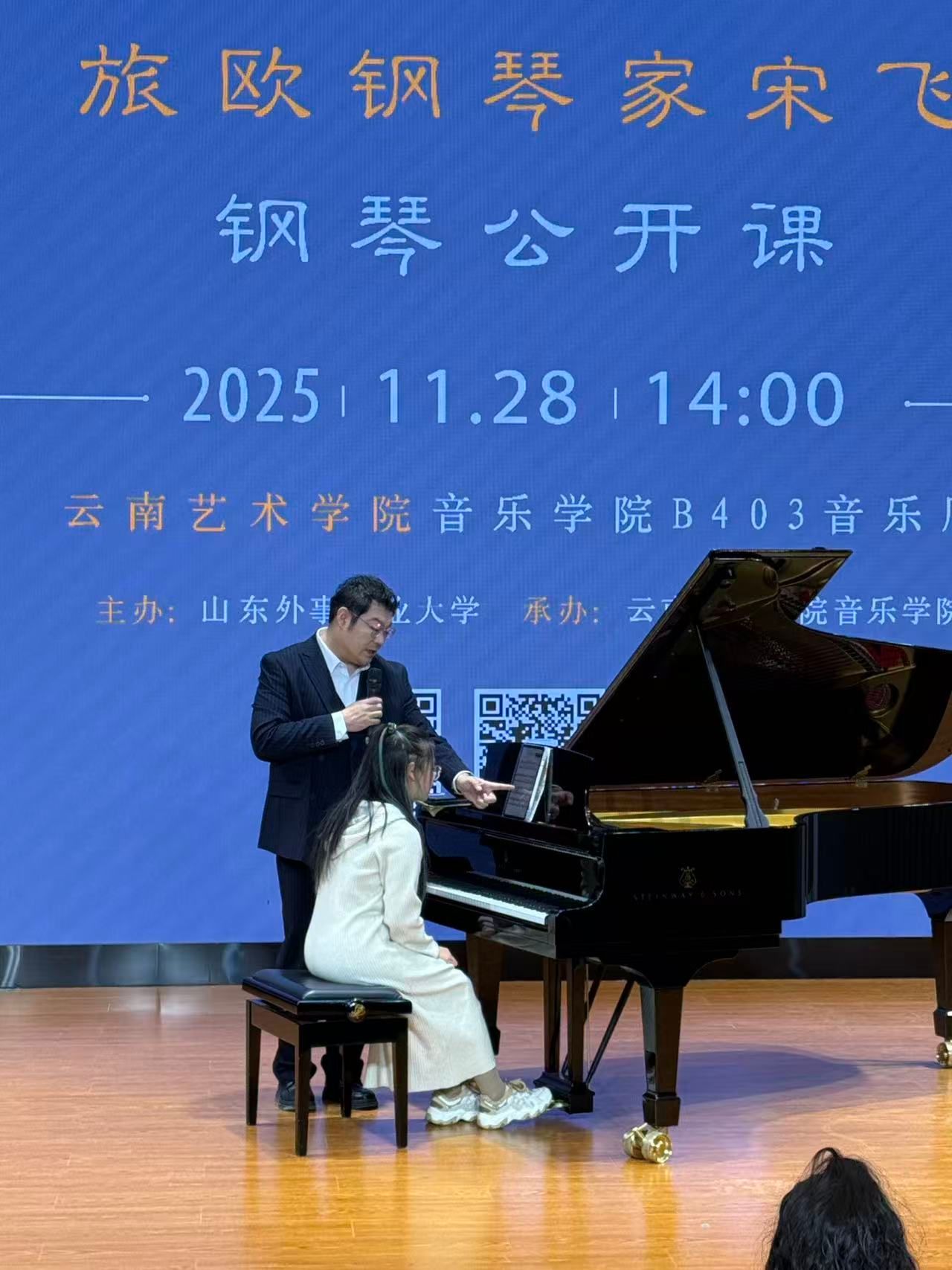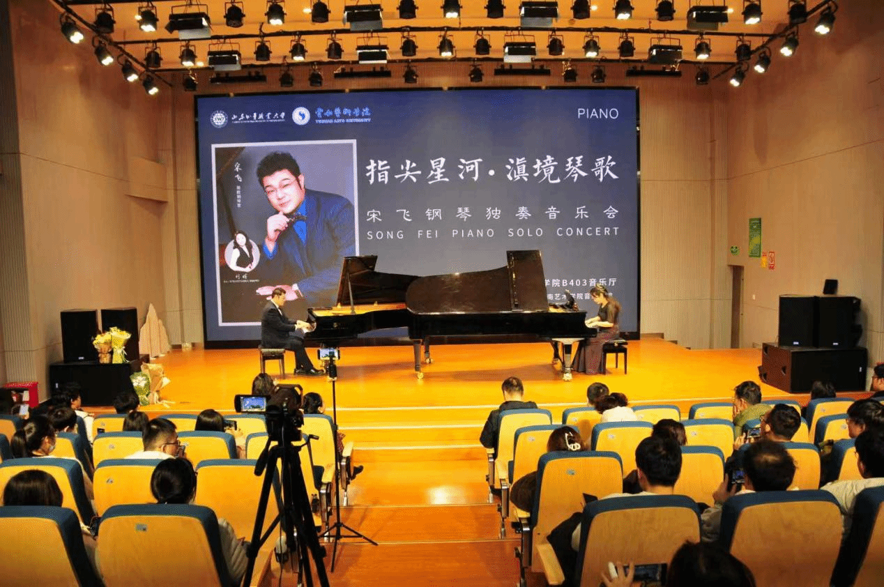 当日晚上,db真人体育官网在B403多功能厅举办了指尖星河·滇境琴歌——宋飞钢琴独奏音乐会。旅欧钢琴家、山东外事职业大学国际钢琴艺术中心主任宋飞以“中西对话”为核心理念,通过精湛技艺与深刻洞察,给钢琴系师生演奏了贝多芬《月光》《黎明》奏鸣曲、肖邦两首夜曲以及《黄河钢琴协奏曲》与张朝《皮黄》。音乐会上,宋飞与公司钢琴系刘晖副教授共同演奏《黄河钢琴协奏曲》,为观众带来极致的听觉享受,更在艺术传承、文化融合与精神引领层面彰显出多元价值与深远意义。