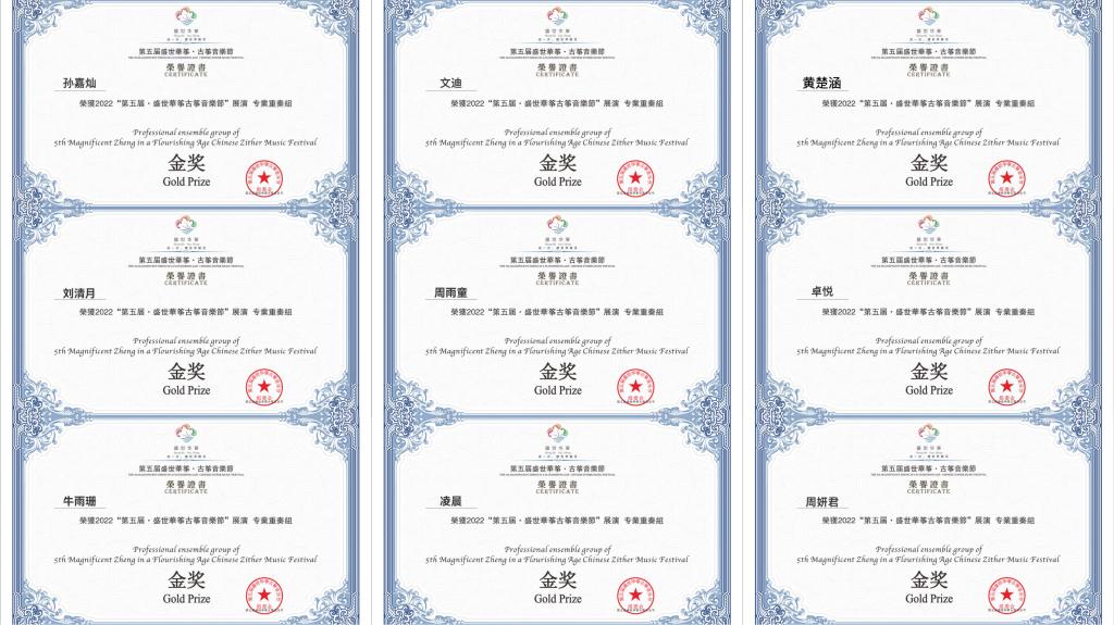 近日,在“2022第五届盛世华筝古筝音乐节”中,公司国乐系“云上弦歌筝乐团”以高弘扬老师作曲和郭乐老师指导的作品《云旎》参加比赛,荣获全国专业重奏组“金奖”。