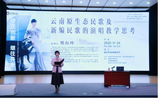 2022年11月25日下午,国家一流专业建设点建设系列讲座暨云南民族声乐大讲堂第二期“守正创新 继往开来”——云南原生态民歌及新编民歌的演唱教学思考在DB视讯安康音乐厅开讲。本次讲座由db真人体育官网经理林林教授主持,db真人体育官网民族声乐系系主任陈红玲教授主讲。讲座采用线上线下的同步观看方式,引起业内的高度关注与好评。