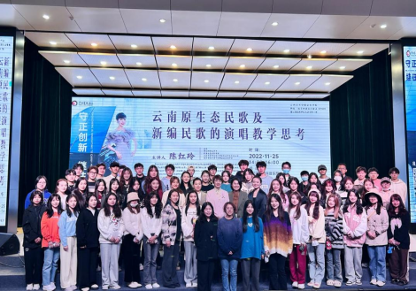 在现场观众的掌声中,讲座接近尾声,陈红玲教授引用习近平总书记在中国文联十一大、中国作协十大开幕式上的讲话精神,“守正与创新共生互补,守正是创新的根基,发挥主导;创新是守正的补充,相辅相成。我们必须融入新时代、适应新特点、满足新要求、解决新问题、汇聚新动力、开创新局面,在守正创新中实现文化强国。”所以云南民歌的传承与发展需要做到以下几点:一是多挖掘整理传统原生、本土民歌,这能为民歌的创作与改编提供良好的素材;二是多与外界合作,借助新媒体的力量宣扬民歌;三是提高新一代青年对民歌的接纳与包容,这一点我们专业员工更应该做出表率,需要更深入了解原生民歌、古曲、戏剧并传承;四是积极开展民歌创新活动,找到民歌艺术与时代发展之间的契合点,使民歌能符合当代人的文化需求和音乐审美,在历史长河中永唱不衰。最后陈红玲教授表示,希望大家更多的关注并演唱云南民歌,也呼吁作曲家们能新编更多好听与时俱进的云南民歌。