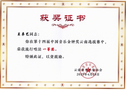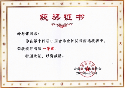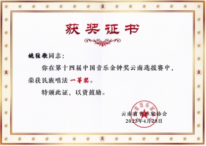 2023年4月24日至28日,第十四届中国音乐金钟奖云南选拔赛在公司举行。本次大赛汇集了云南省各高等院校、省级文艺团体及各地州推送的优秀选手,经过紧张激烈的角逐,公司多名师生斩获佳绩,为公司赢得了荣誉。