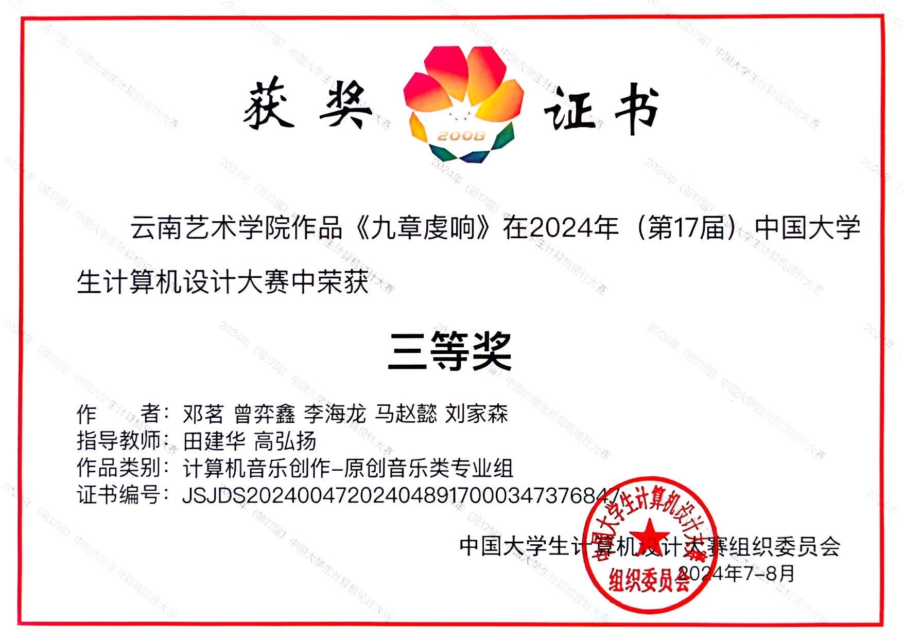 2024年(第17届)中国老员工计算机设计大赛决赛于8月18日开幕、8月21日落幕,该赛事汇集了全国各大高校的精英学子,其中计算机音乐创作组有全国各大高校共106件作品进入决赛。db真人体育官网作曲系教师指导的两部作品以云南省一等奖的成绩进入全国总决赛,两部作品均荣获计算机音乐创作-原创音乐类专业组三等奖。