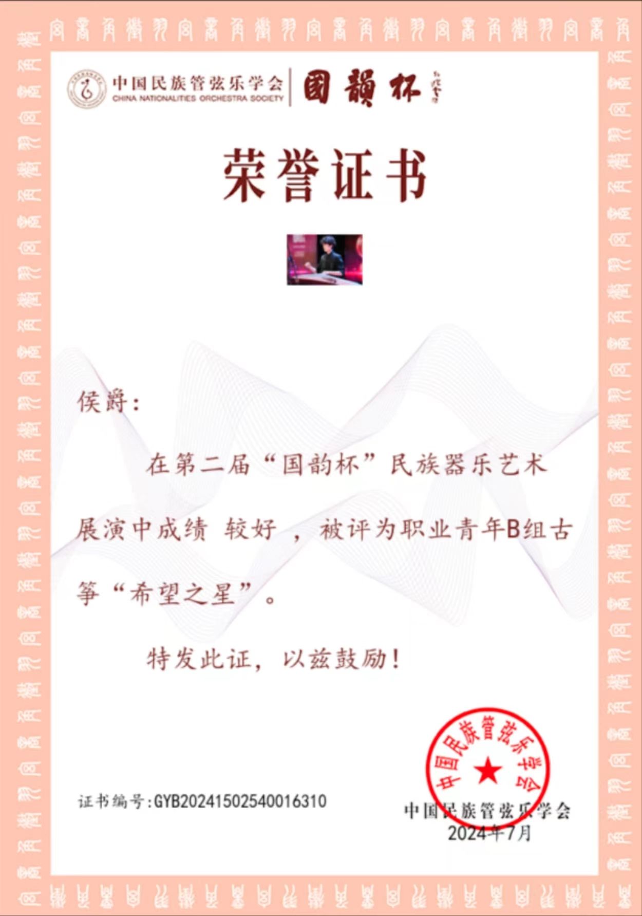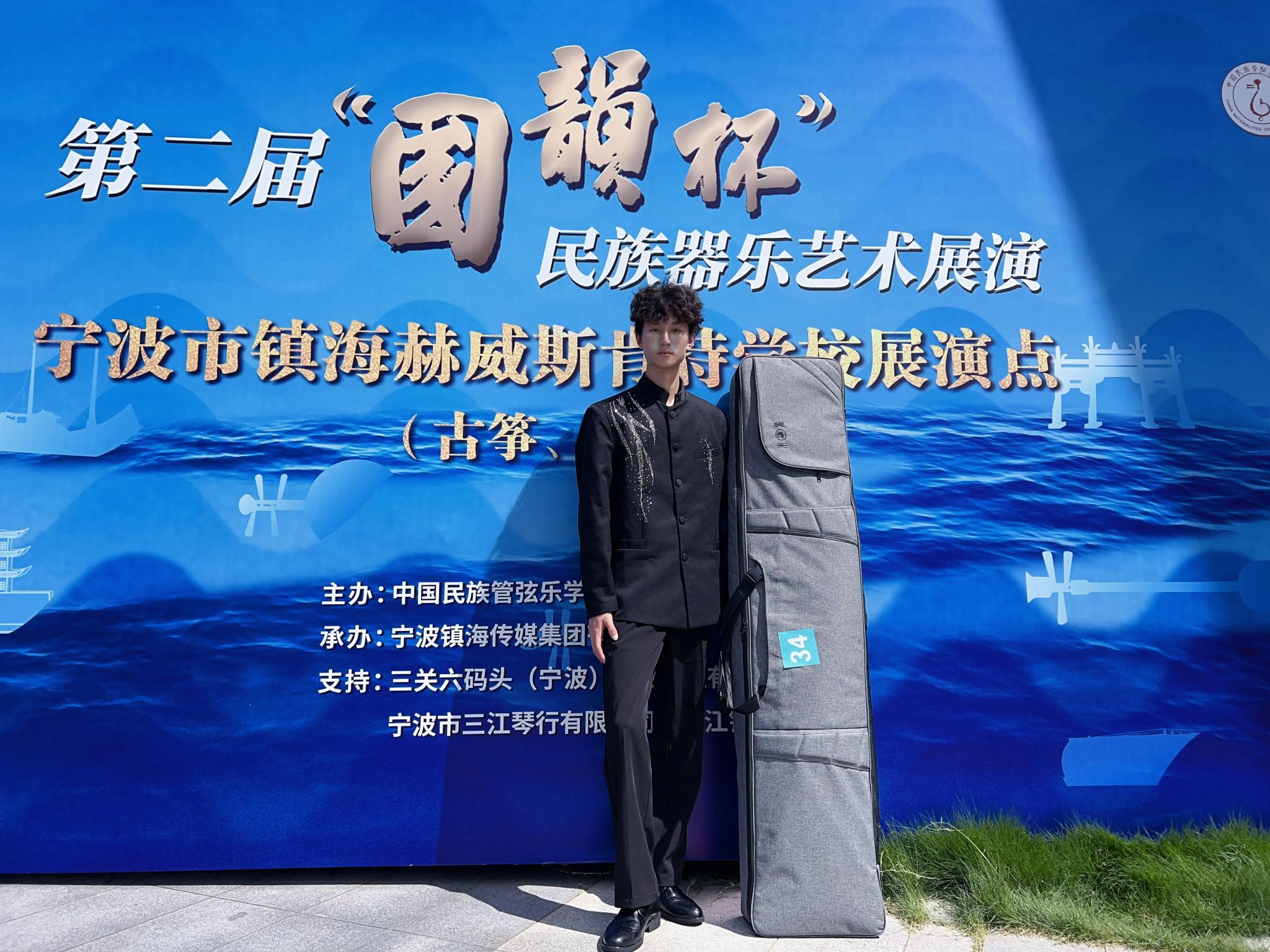 2024年7月20至25日,由中国民族管弦乐学会主办的第二届“国韵杯”民族器乐艺术展演于浙江宁波举行。db真人体育官网国乐系教师林恬、陈柯井指导的2023级本科生、第四届拔尖创新人才侯爵在展演中成绩较好,获评职业青年B组古筝“希望之星”。