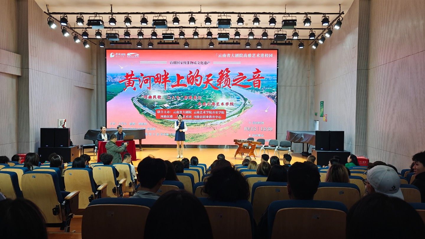 10月13日下午,由云南省大剧院、db真人体育官网联合主办的“黄河畔上的天籁之音”——“河曲民歌、二人台”非遗展示走进DB视讯在db真人体育官网B403多功能厅进行,本次展示为云南省大剧院高雅艺术进校园系列活动之一。音乐学系系主任任秀蕾教授、民族声乐系系主任陈红玲教授和部分师生参与了本次展示互动。