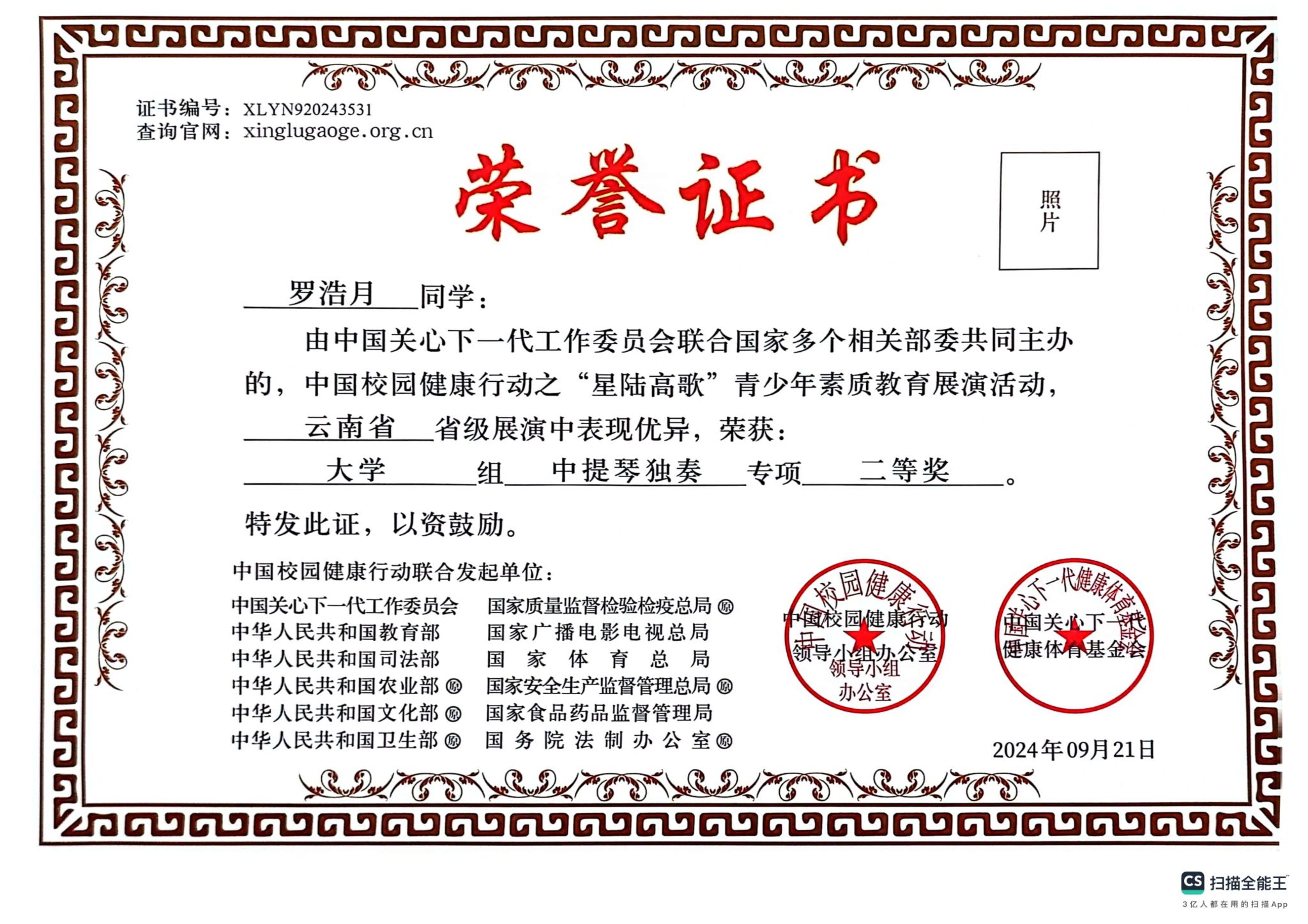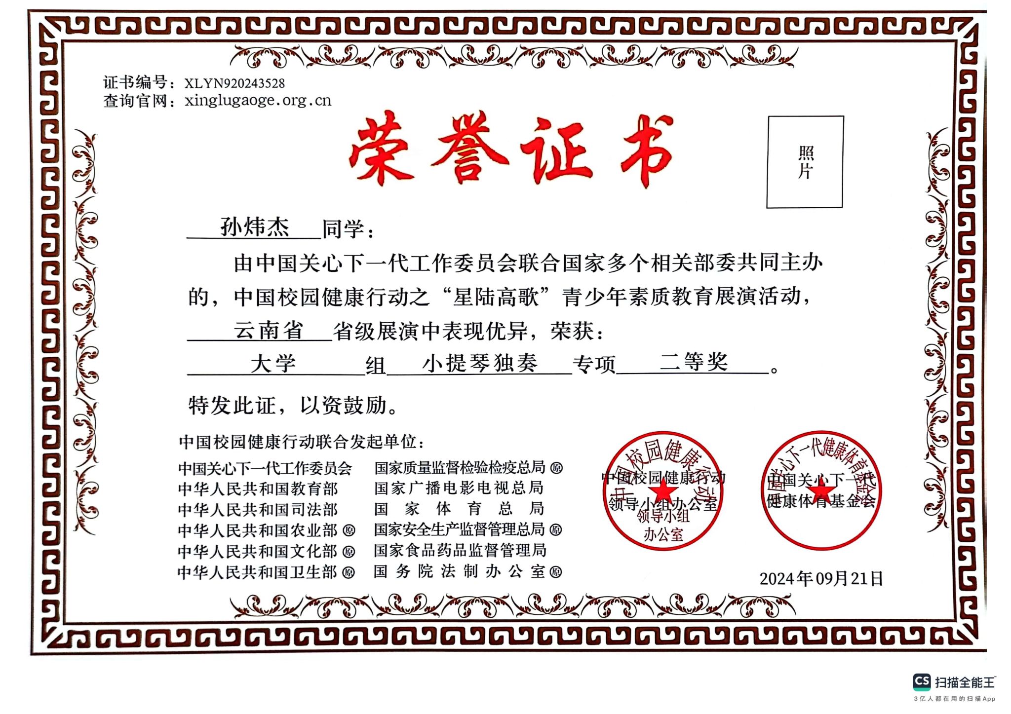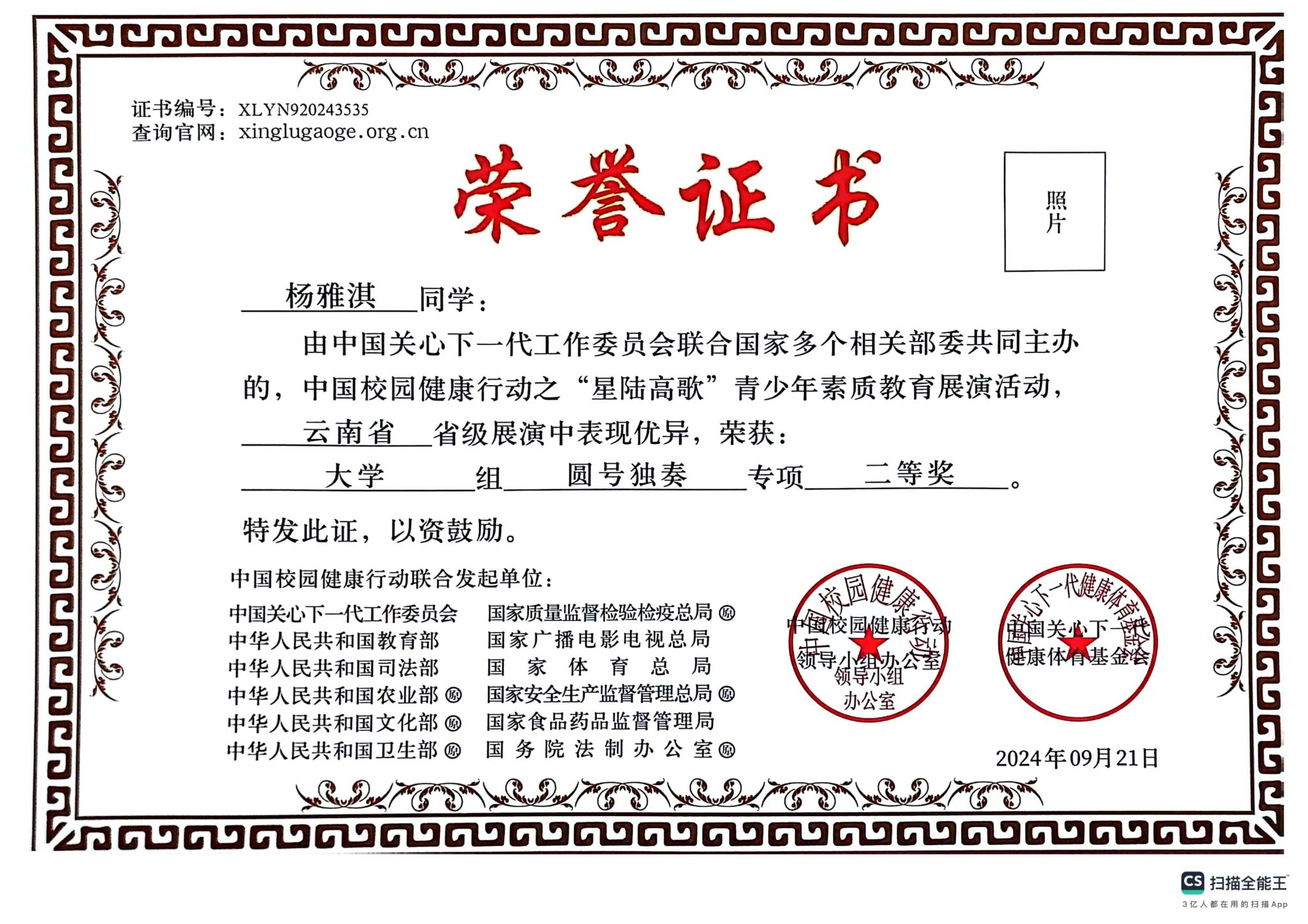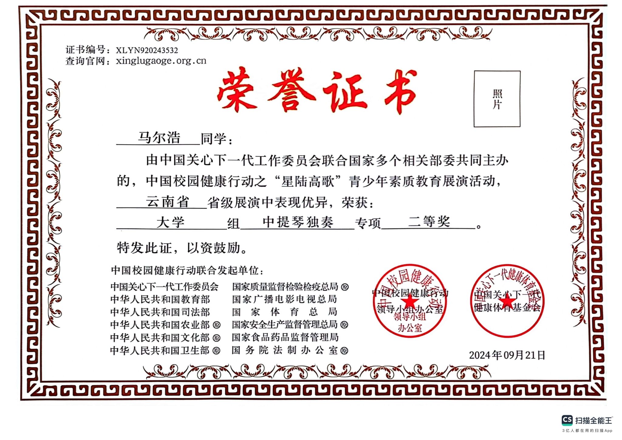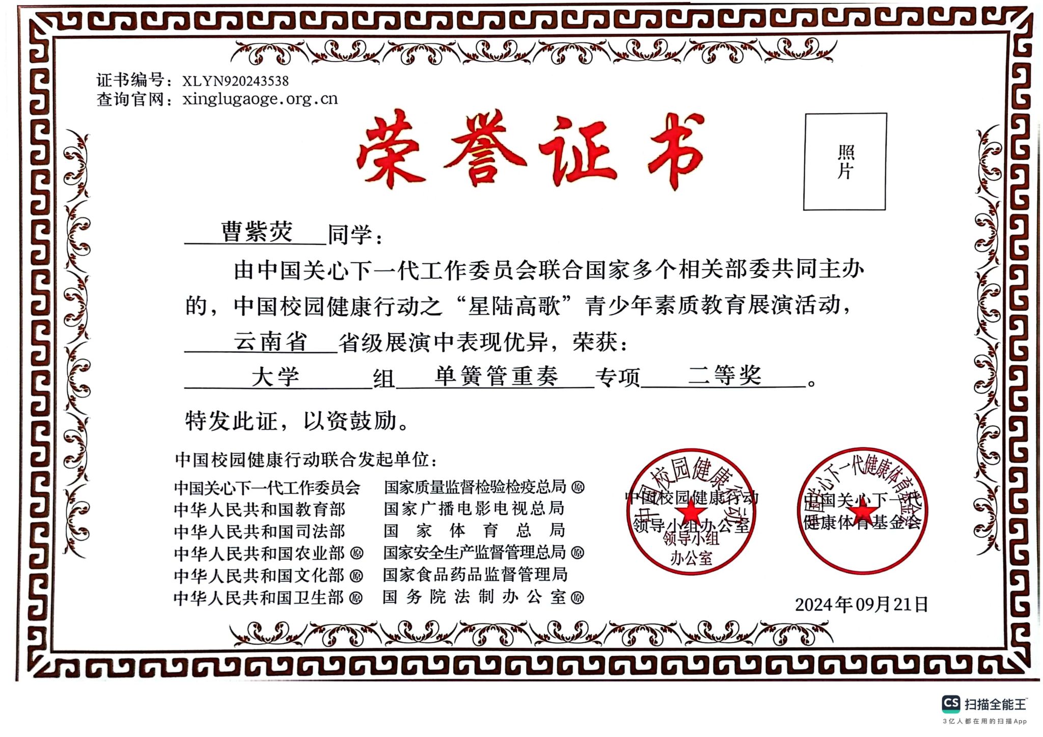 孙炜杰、李宇童、罗浩月、马尔浩(指导教师:王鹏),张德广(指导教师:王昱旻),杨雅淇(指导教师:吕佳奇)获大学组独奏二等奖。