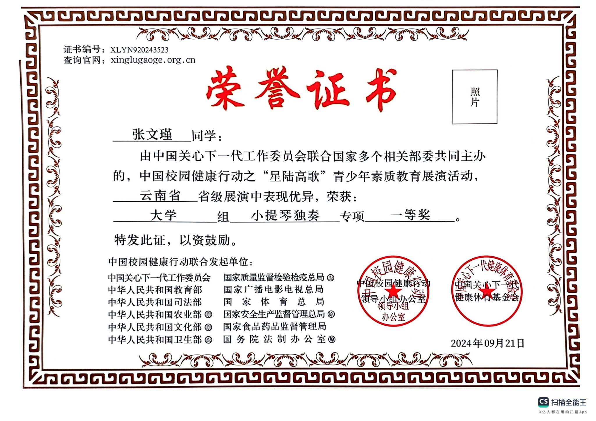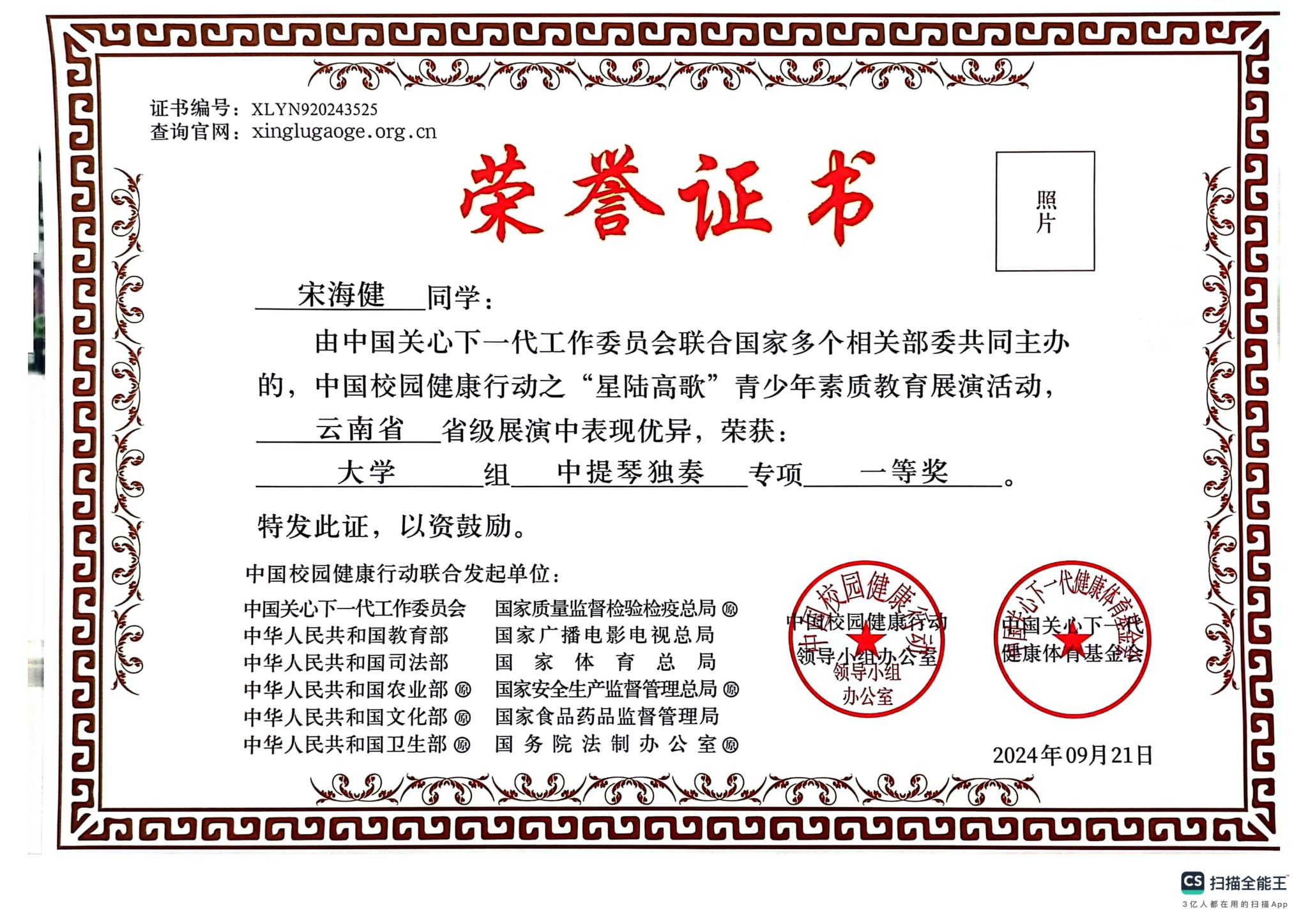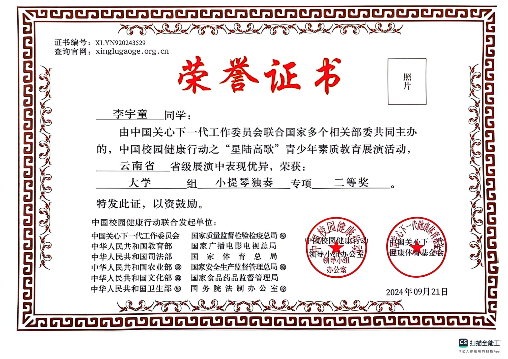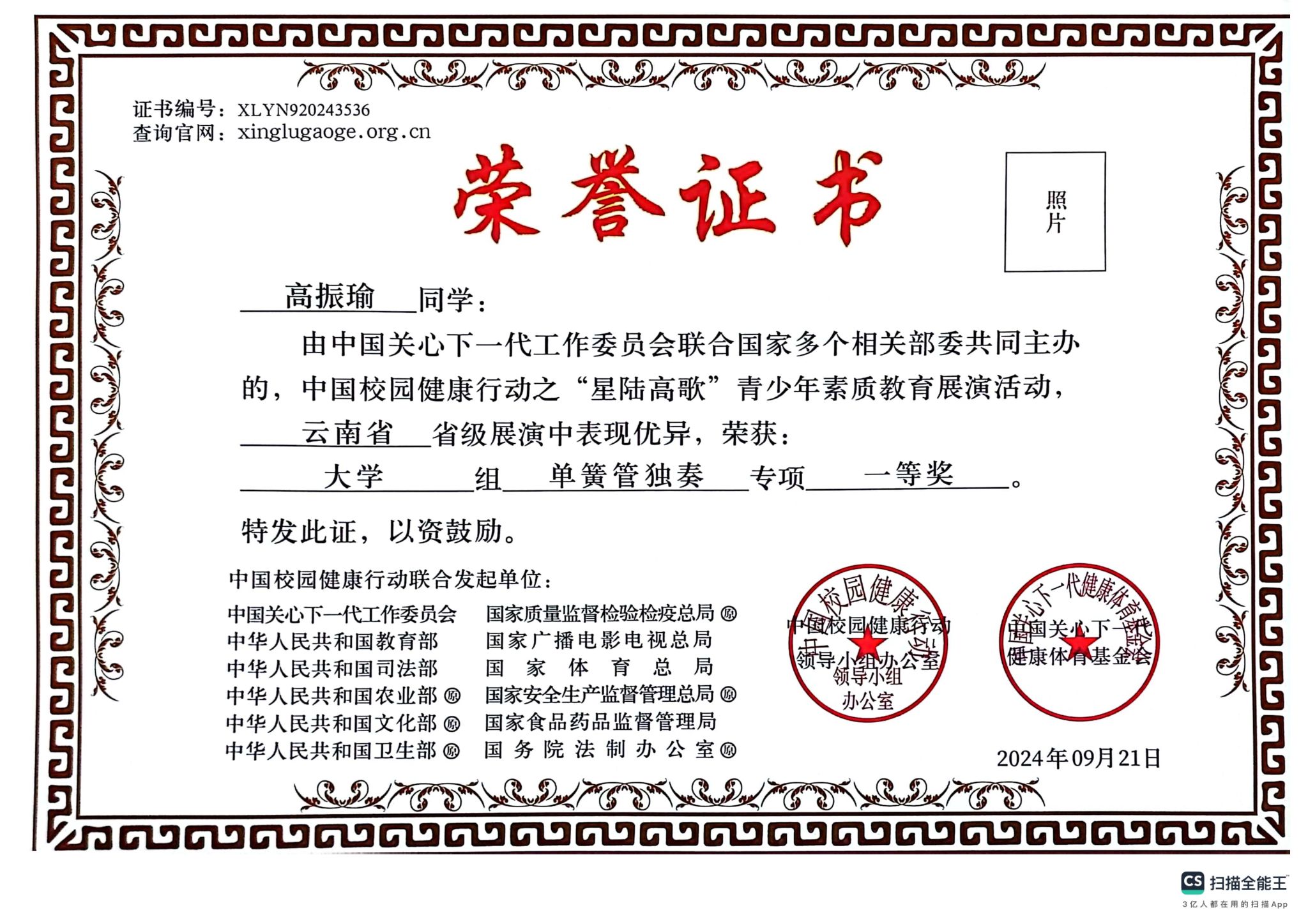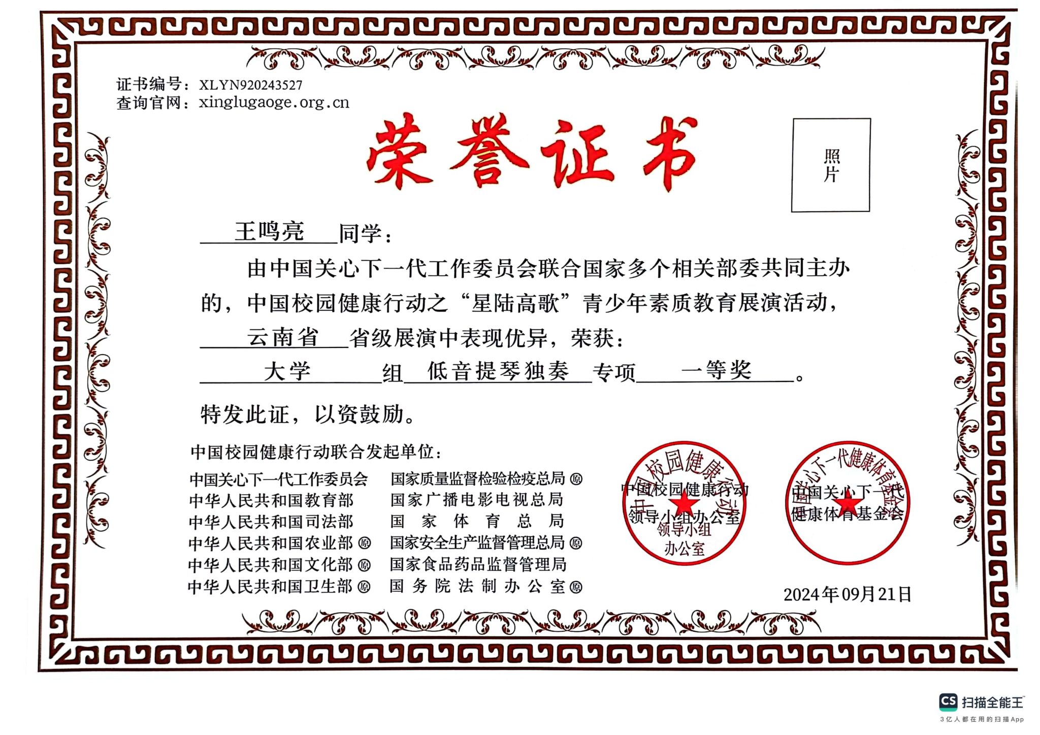 孙炜杰、李宇童、罗浩月、马尔浩(指导教师:王鹏),张德广(指导教师:王昱旻),杨雅淇(指导教师:吕佳奇)获大学组独奏二等奖。