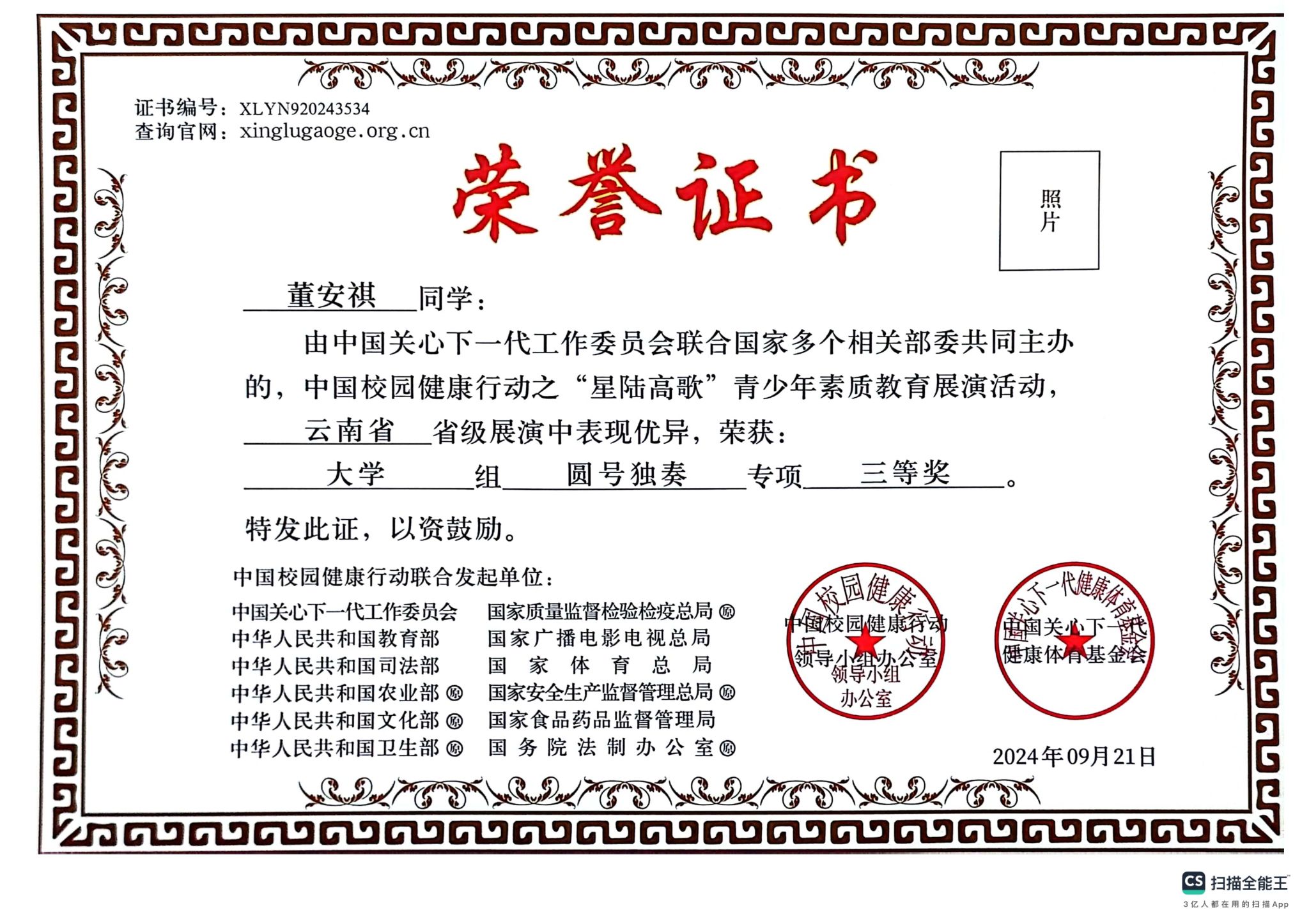 董安琪(指导教师:吕佳奇)获大学组独奏三等奖。