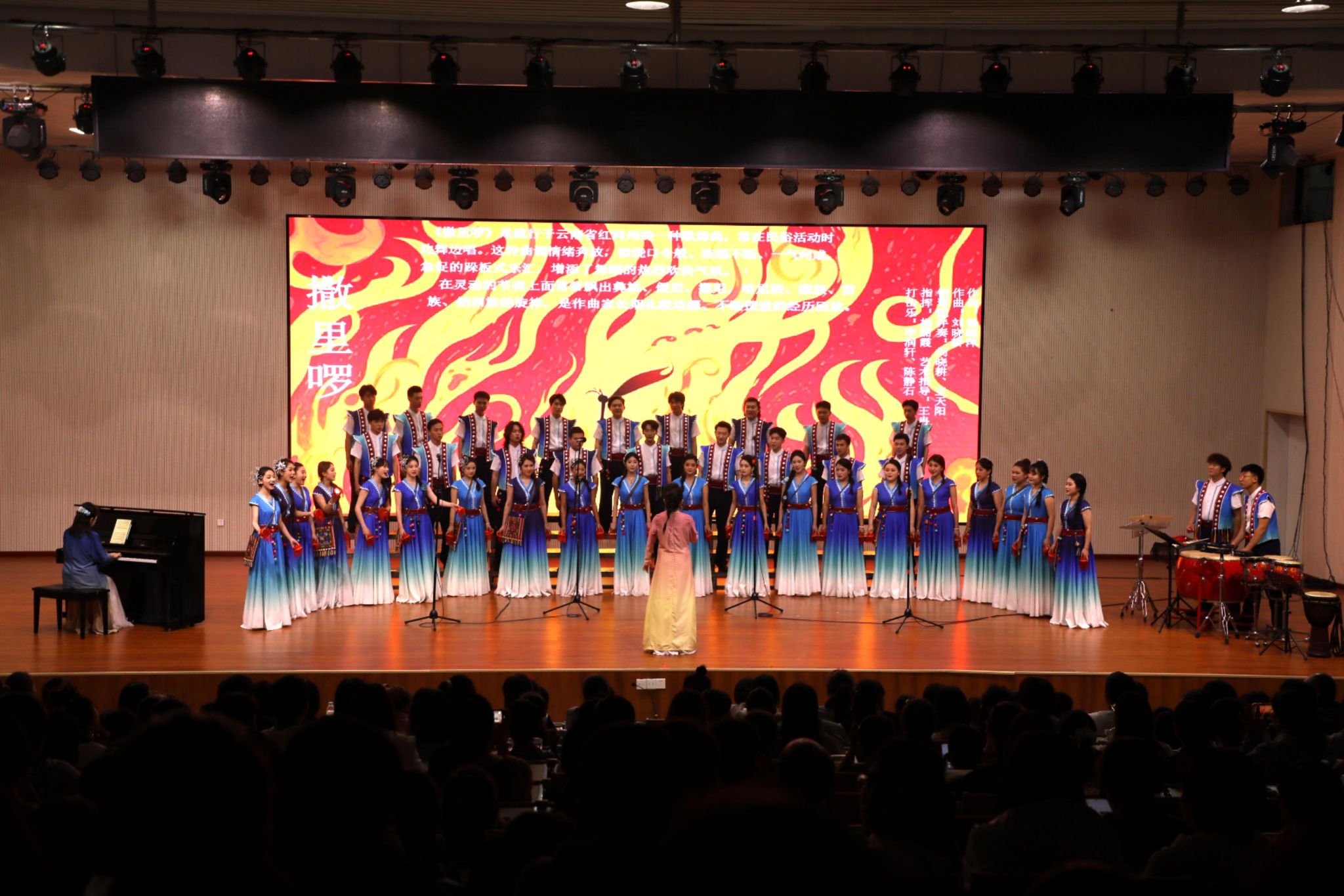 音乐会座无虚席,DB视讯青年合唱团为现场观众带来囊括汉族、彝族、藏族、纳西族、傈僳族、布朗族、基诺族、傣族、佤族等云南多民族母语及特有的声腔和乐器元素的作品,集合了一批立足云南、享誉国内外的词曲作家优秀代表作如《撒里罗》《山寨猎歌》《纳西古调-寻》等15首合唱作品,多元化展现云南多民族音乐文化,通过对中华优秀传统文化的创造性转化和创新性发展,带领千余名观众领略民族和谐之声、民族团结之美。