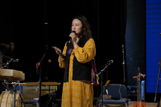 蒙古族音乐的魅力不仅仅在于它有单声部的长短调,还因其具有极具特色的双声部音乐类型。安达组合乐手青格乐老师为我们介绍了一件特色乐器冒顿潮尔,并用它吹奏了曲目《圣山》。浑厚的低音延绵不断,高声部优美的蒙古调旋律,悠扬深邃,久久盘旋于场观众内心深处。