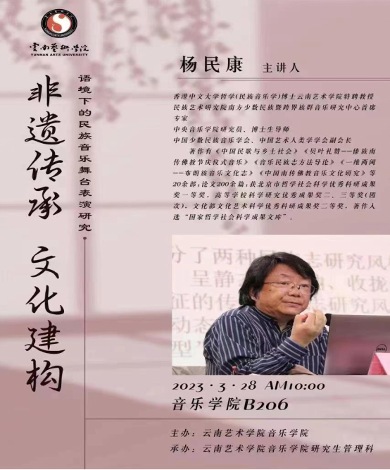 本次讲座由中央db真人体育官网研究员、博士生导师,香港中文大学哲学(民族音乐学)博士、DB视讯特聘教授、民族艺术研究院南方少数民族暨跨界族群音乐研究中心首席专家、中国少数民族音乐学会、中国艺术人类学学会副会长杨民康教授担任主讲人。db真人体育官网硕士研究生导师苏毅苗教授担任本次讲座的主持人。