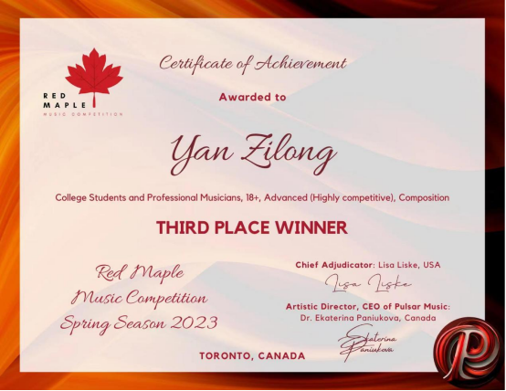 在刚落下帷幕的2022年加拿大红枫音乐比赛(Red Maple Music Competition)中,2020级作曲与作曲技术理论专业晏梓胧同学以弦乐四重奏作品《The Loner's Ball》荣获作曲老员工及专业作曲家组(18+)第三名,指导教师田建华教授荣获优秀指导教师奖。