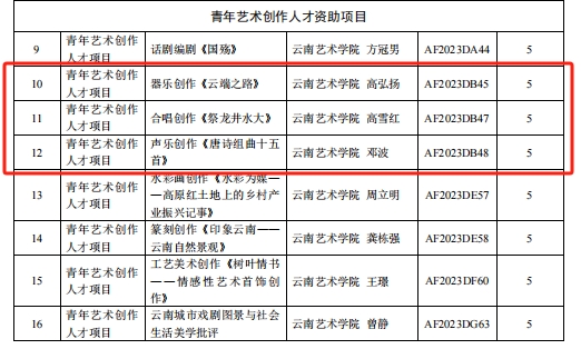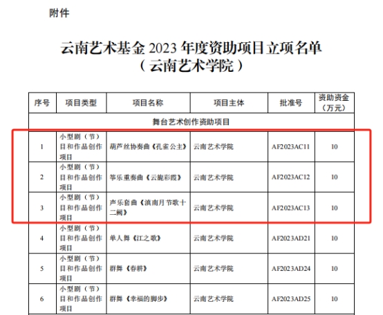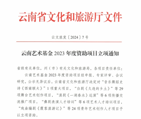云南艺术基金2023年度资助项目经申报、专家评审、会议研究,公示无异议后,云南省文化和旅游厅决定对1项重大项目,29项舞台艺术创作项目,6项传播交流推广项目,6项艺术人才培训项目,24项青年艺术创作人才项目予以立项资助。db真人体育官网共获得8项立项,名单如下: