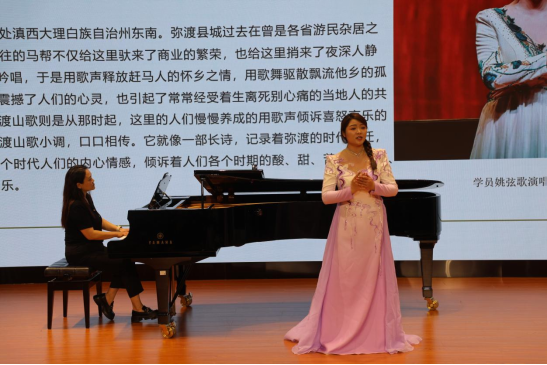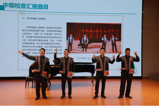 汇报会对女高音独唱《弥渡山歌》、流行独唱《盼》、男中音独唱《梦里我曾回去过》、男声四重唱《螃蟹歌》共4首作品进行了汇报演出。