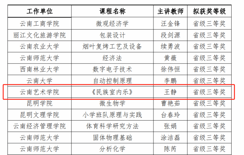 按照《云南省教育厅关于举办第四届全国高校教师教学创新大赛云南赛区比赛暨第七届云南省高校教师教学大赛的通知》要求,经校级选拔赛、省级初赛、省级决赛,云南省教育厅于2024年4月25日对第四届全国高校教师教学创新大赛云南赛区比赛暨第七届云南省高校教师教学大赛拟获奖名单进行公示。由db真人体育官网国乐系系主任王静主讲的课程《民族室内乐》获正高组省级三等奖。