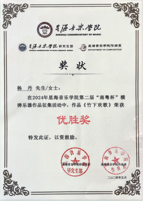 2024年5月,2021级作曲班员工杨丹所创作的古筝曲《竹下欢歌》参加由星海db真人体育官网作曲系、研究生部、艺术实践与社会服务中心、教务部联合主办,声像与智能音乐实验室承办的2024第二届“南粤杯”横弹乐器作品征集活动中荣获“优胜奖”,指导教师:李娟。