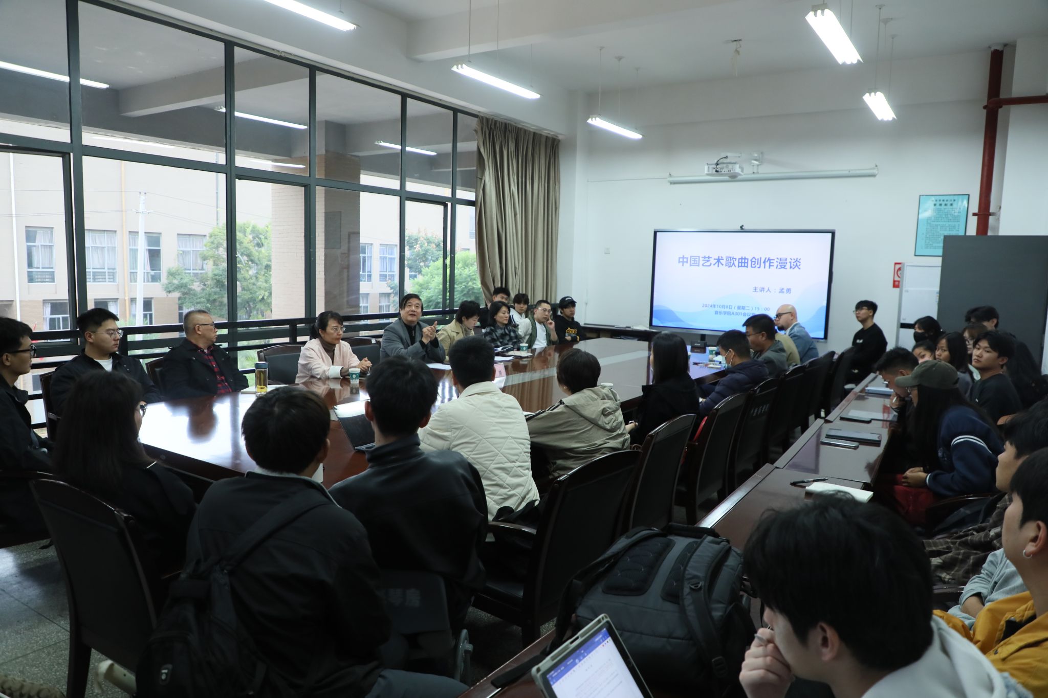 2024年10月8日,中国著名作曲家、国家一级作曲、湖南省文联名誉副主席、中国db真人体育官网特聘教授孟勇应邀在db真人体育官网A301召开了主题为“中国艺术歌曲创作漫谈”的专题讲座。音乐公司党委副书记、经理林林,db真人体育官网副经理侯静宜,理论作曲系系主任田建华,以及全体作曲系专任教师和部分作曲系研究生、声乐歌剧系教师及研究生参加了本次讲座。