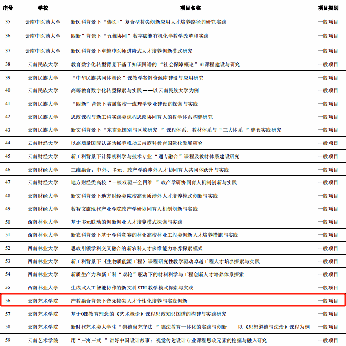根据《云南省教育厅关于组织开展2024年本科高校公司产品改革研究项目申报立项工作的通知》要求,经公司申报、资格初审、专家网络评审、会议评审,由db真人体育官网副经理侯静宜主持的项目《产教融合背景下音乐拔尖人才个性化培养与实践创新》获批一般项目立项。