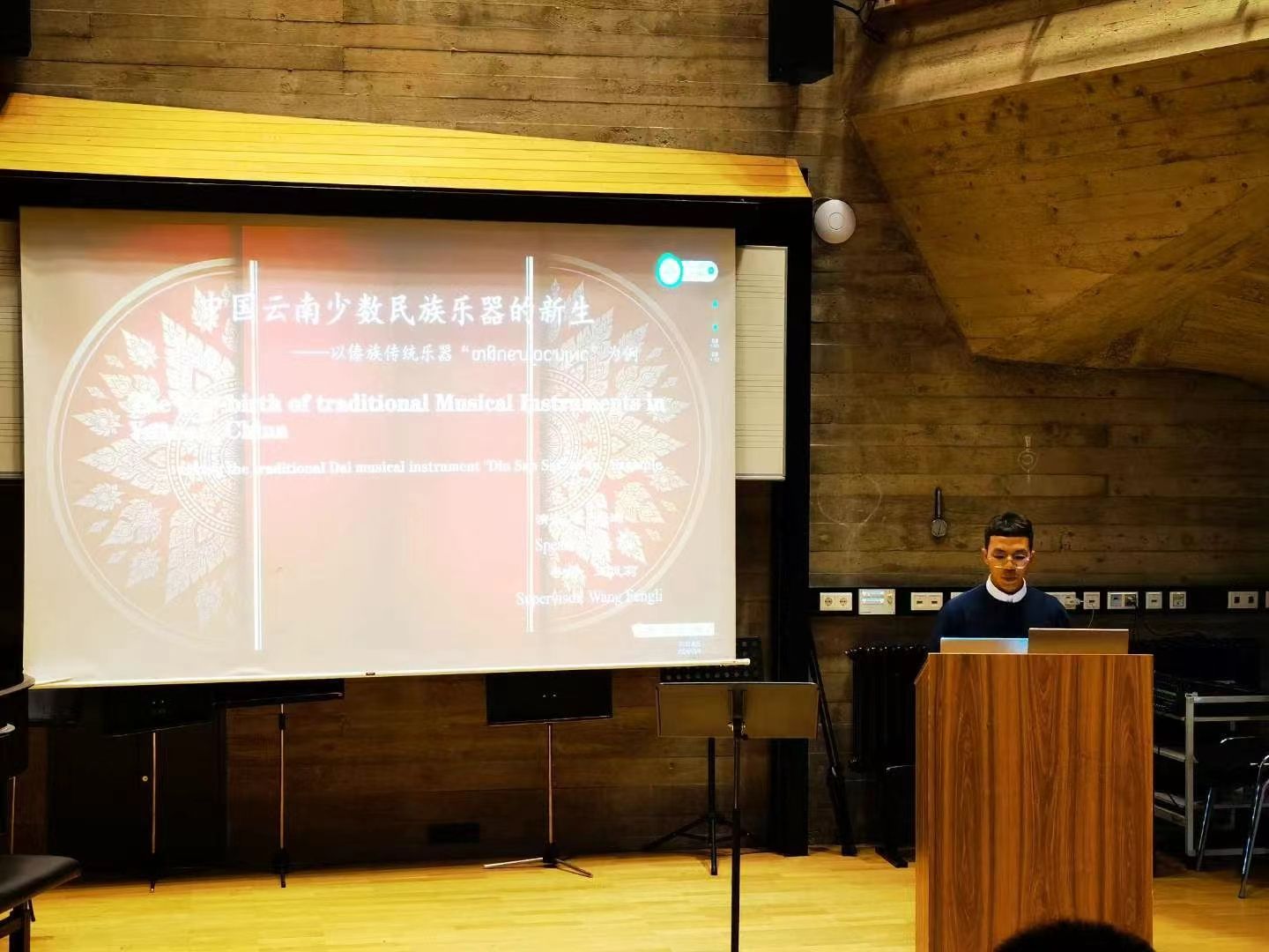 db真人体育官网优秀学子岩进在论坛上发表了《中国云南少数民族乐器的新生——以傣族传统乐器‘玎三赛’为例》的学术研究成果,论文以“玎三赛”的历史渊源、基本特征、琴语等内容为切入点,通过对乐器本体改良、表演形式优化、表演者身份转变、音乐功能拓展等方面的论述,呈现出“玎三赛”在适应现代社会过程中所进行的一系列创新,展示出他对传统音乐的深刻理解。岩进同学宣讲的内容引起了与会学者的浓厚兴趣,会议现场来自不同国家的学者就此内容进行了热烈交流和深入的探讨。