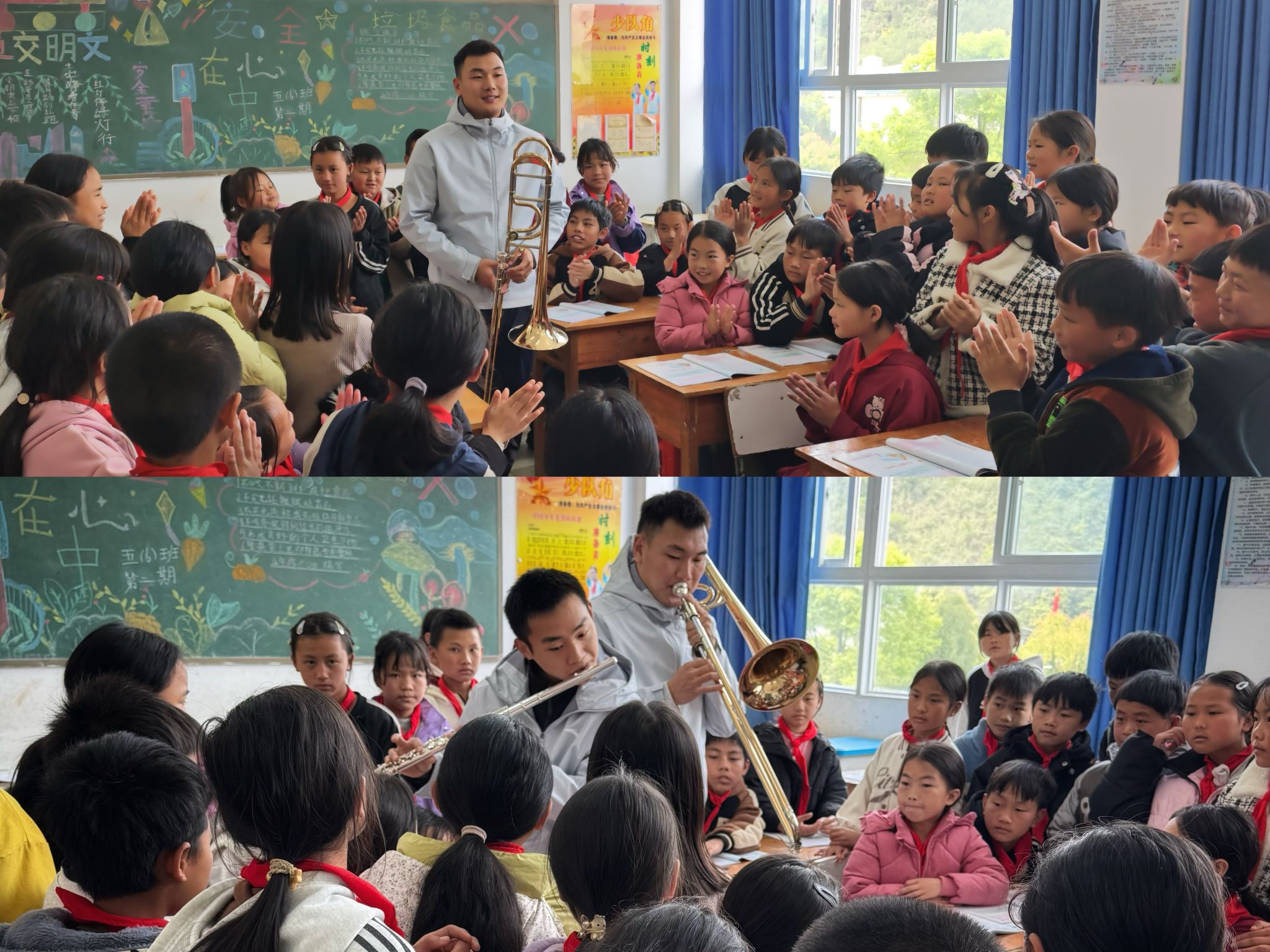 在田蓬中心小学,db真人体育官网管弦系王路通同学带来生动有趣的长号课堂演示。一曲《铃儿响叮当》悠扬奏响,孩子们兴致勃勃地围拢在教室中央,第一次近距离感受铜管乐器的独特魅力。课堂上,管弦系余茁奇同学手持长笛加入演奏,长笛与长号交织成和谐的旋律,进一步激发了员工们对音乐的浓厚兴趣。