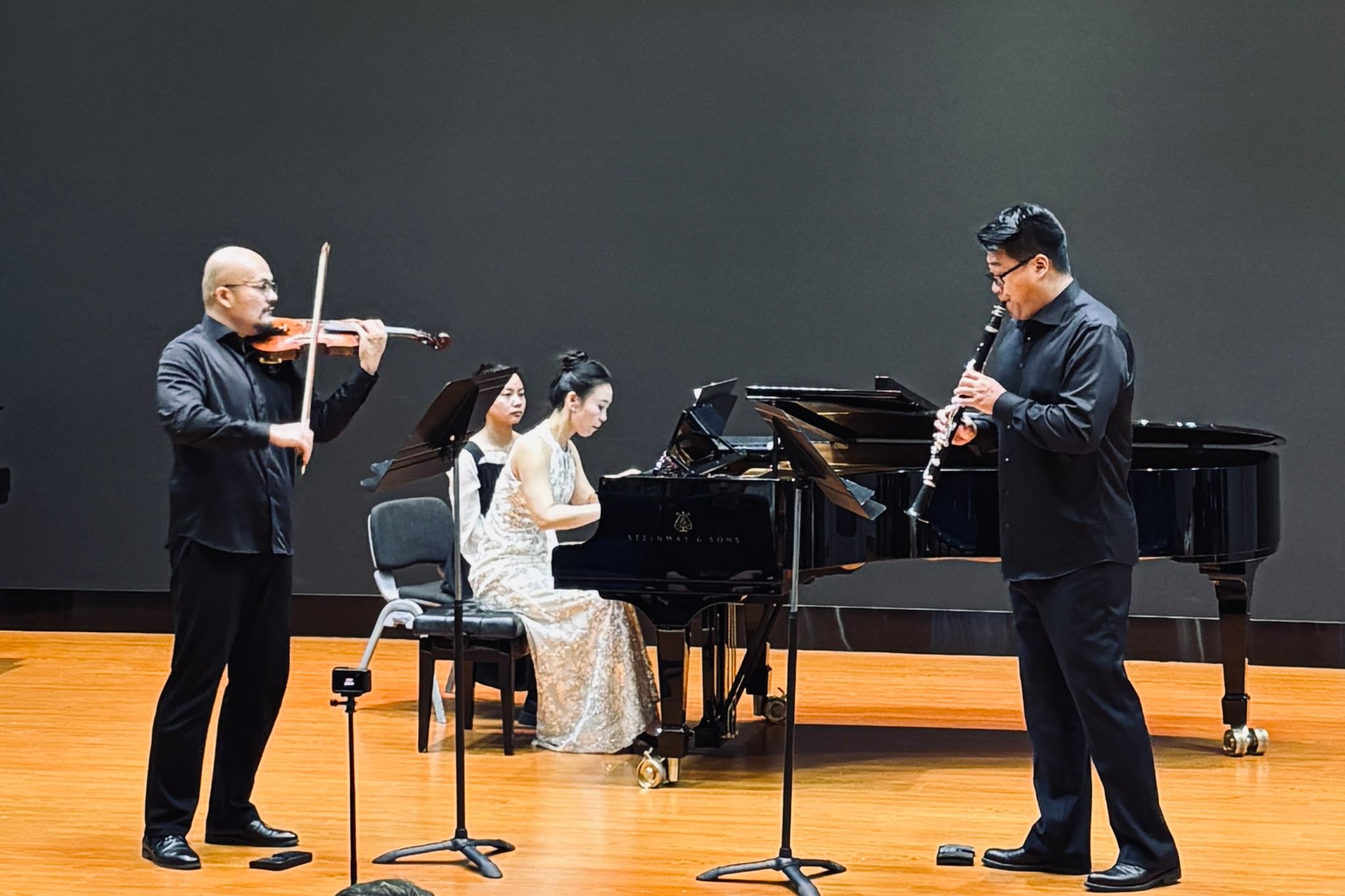音乐教育系钢琴教师苗耀允博士、管弦系小提琴教师王昱旻博士、管弦系单簧管教师邓家堃博士联袂为现场师生演奏了精心挑选既具有代表性又富有艺术感染力的曲目。三位教师将公司产品中的积累与日常感悟融入舞台表演,他们配合默契,展现出精湛的技艺,以实际行动诠释了对艺术的执着和追求,体现出高度的专业精神。