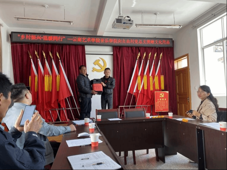 音乐公司党总支联合自由村党总支,到自由村委会开展“乡村振兴·温暖同行”为主题的结对共建暨党史学习教育主题活动,召开基层党建工作交流座谈会,并向自由村党总支捐赠文化用品。在座谈会上,音乐公司党总支书记纳海和自由村党总支副书记自建果分别向参会人员介绍了本党组织的基本情况,并就基层党建工作做交流发言。随后,自由村党总支书记李家程向参会人员介绍了自由村的村情村貌、经济社会发展情况和脱贫攻坚与乡村振兴有效衔接工作,并代表自由村委会接受db真人体育官网文化帮扶用品的捐赠,表达了对音乐学经理期以来结对帮扶工作的感谢。