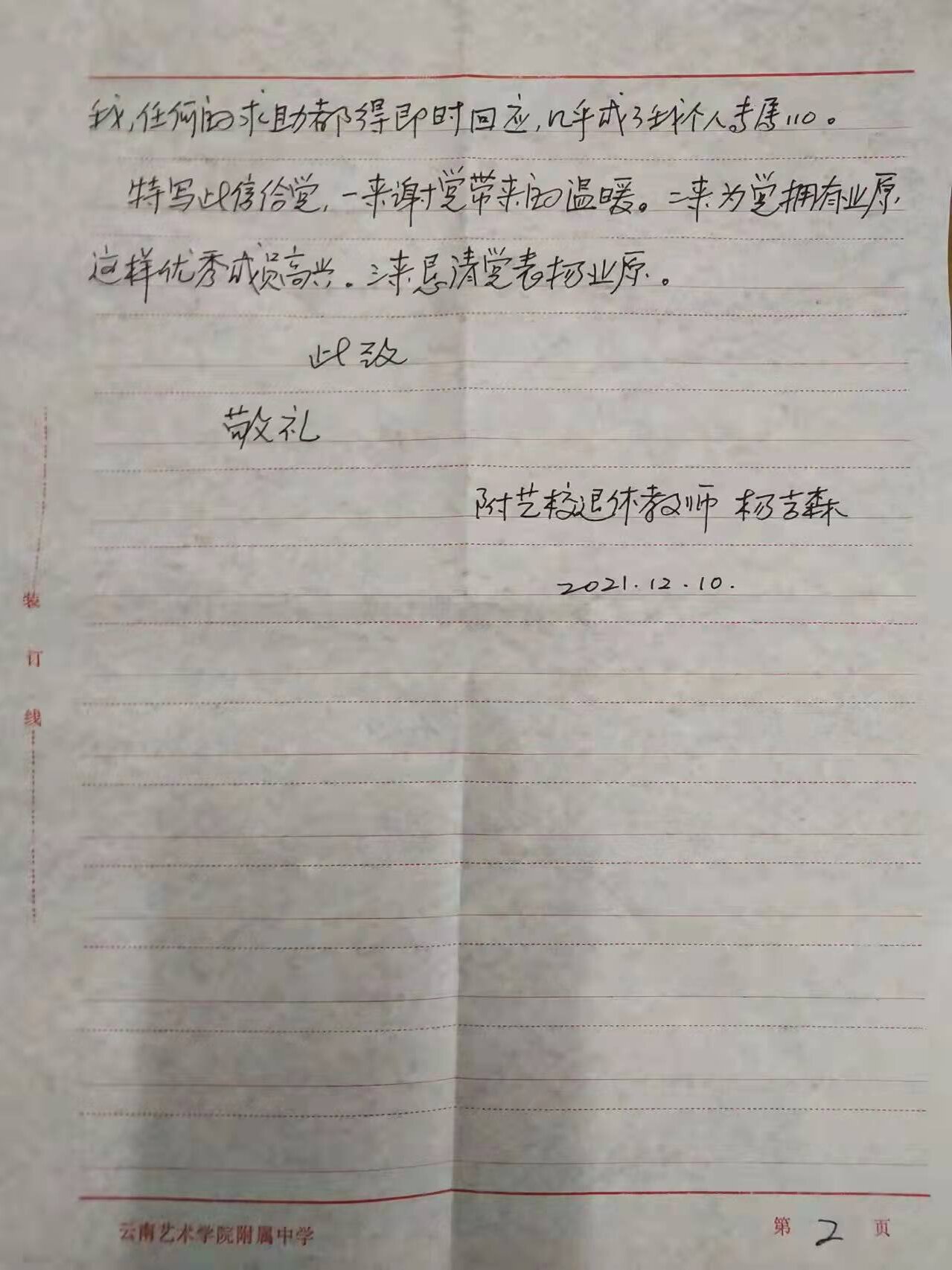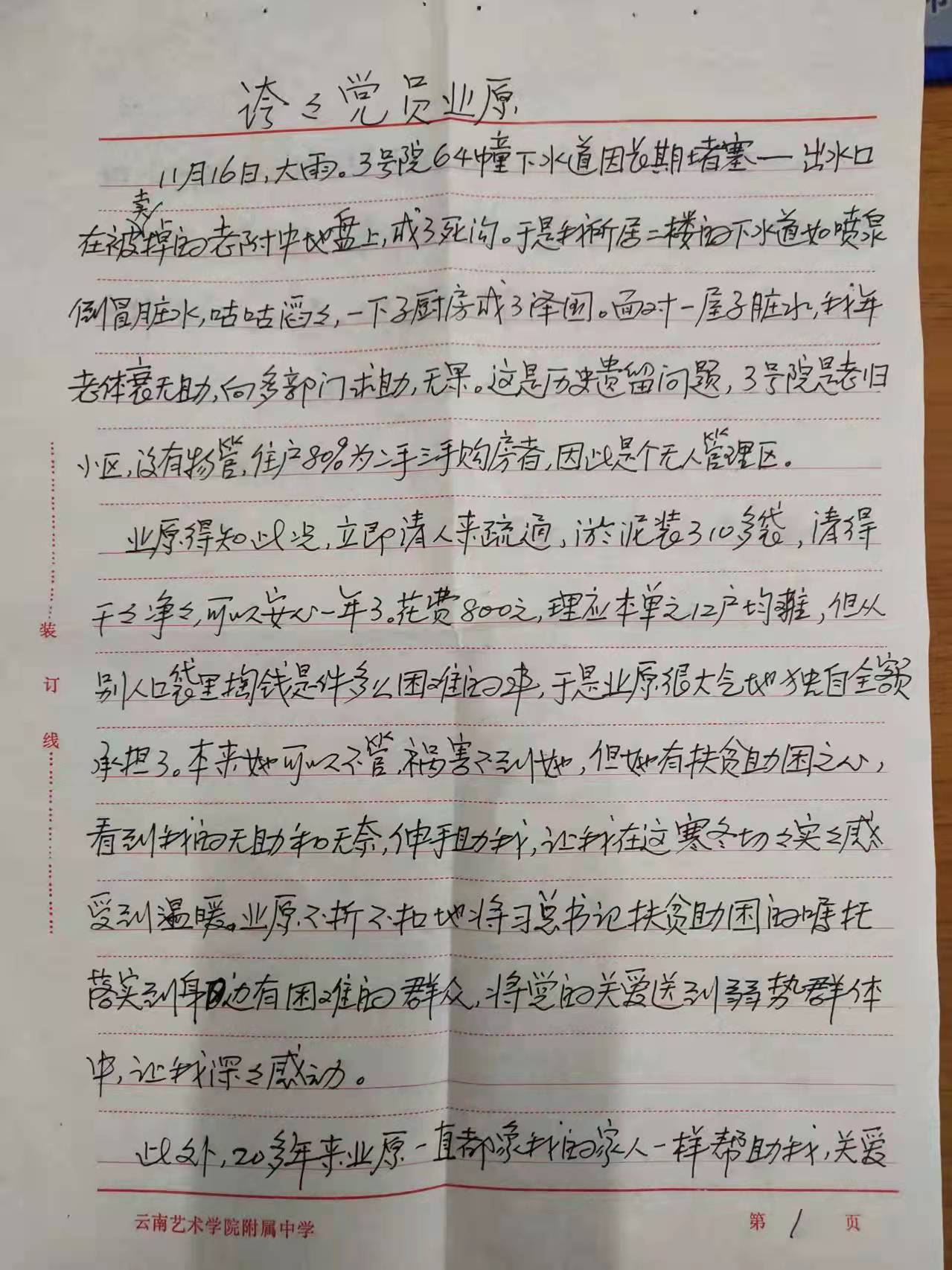 DB视讯离退休杨吉森老师亲笔书写感谢表扬信,感谢音乐公司党员业原同志。