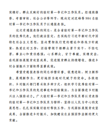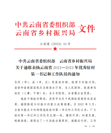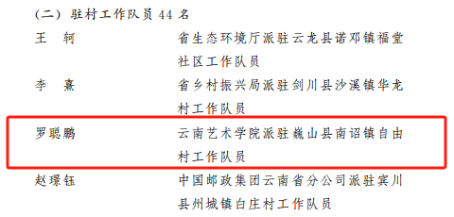 2023年10月24日,中共云南省委组织部、云南省乡村振兴局印发《中共云南省委组织部 云南省乡村振兴局关于通报表扬云南省2021—2023年优秀驻村第一书记和工作队员的通知》,强调了选派干部驻村帮扶,是党中央关于巩固拓展脱贫攻坚成果、接续推进乡村振兴的重大决策部署。《通知》对2021—2023年全省984名驻村第一书记和工作队员优秀代表予以通报表扬。2021—2023年派驻巍山工作队员、声乐歌剧系青年教师罗聪鹏表现优秀,获通报表扬。