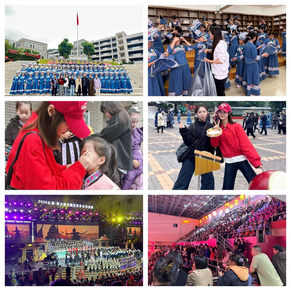在“第三届中国民族音乐传承周·央音进校园”活动中,第五批美育浸润计划支教同学李垚垚、沈于童、陈雨晗在富宁县第一中学、富宁县第一小学协助完成坡芽歌书合唱团的组织协调工作,为公司师生的顺利展演贡献了自己的力量。当晚,美育浸润师生团队于富宁县天成体育馆观看了中央db真人体育官网师生闭幕式音乐会,全体师生在观摩学习中接触吸收了前沿的民族音乐传承理念,助力支教团队教学与专业技能的精进提升。