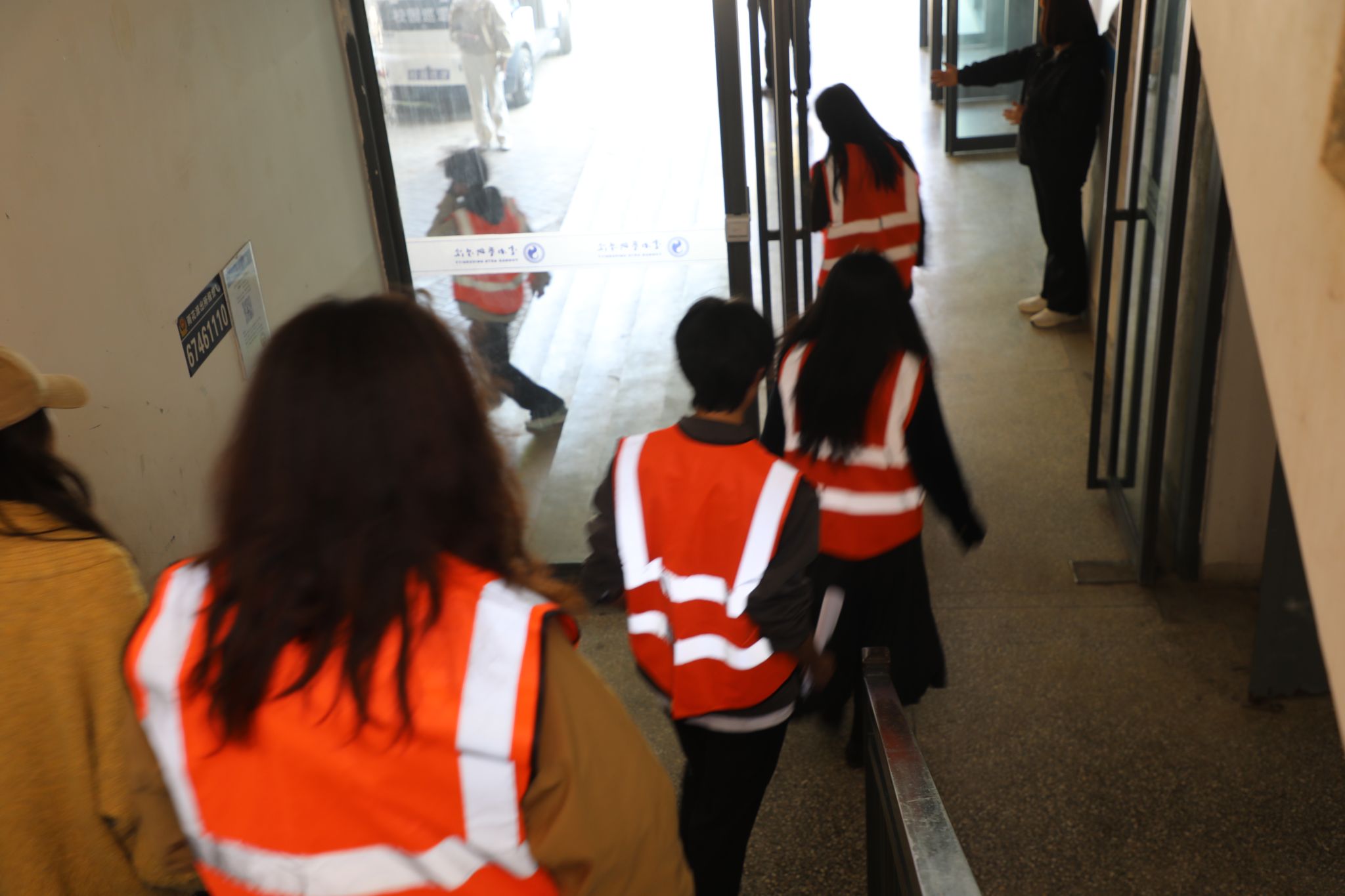 随后,参加演练的师生规范有序地模拟员工宿舍六栋发生火情时的应急疏散。警报响起,引导员迅速响应、有序引导,师生们按照“弯腰、捂鼻、靠墙走”的规范动作,迅速、安全撤离至员工宿舍六栋楼下空地集合点,整个演练过程流程顺畅、安全高效。