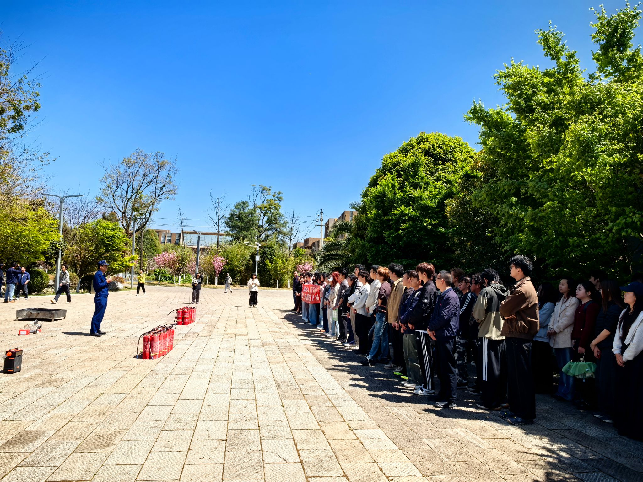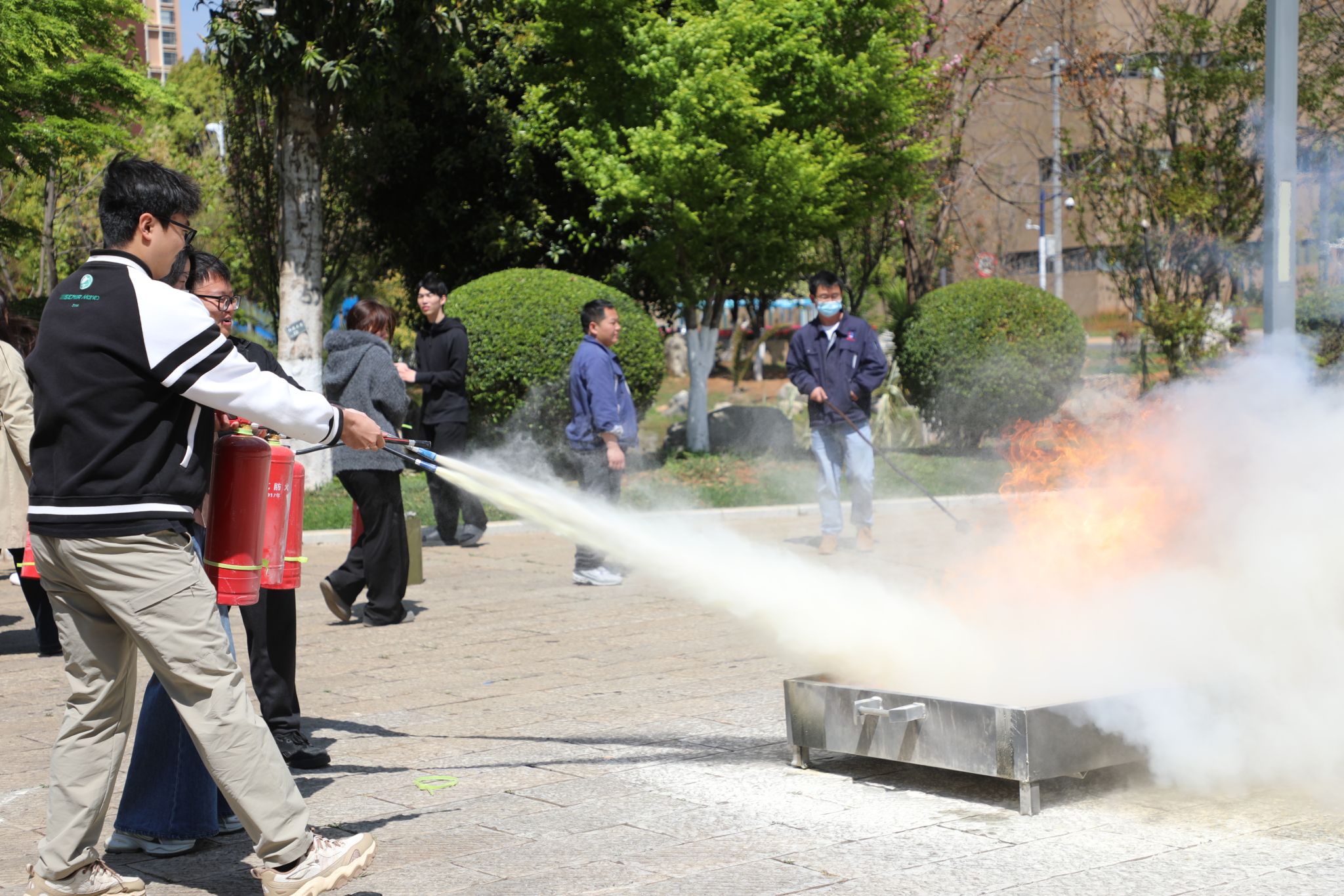 应急疏散演练结束后,全体师生转移至图书馆报告厅旁空地参加灭火演练。呈贡区消防大队的消防员结合实际需求,现场培训消防水管、呼吸罩和灭火器的正确使用方法。在专业指导下,师生代表分批次进行了灭火器实操演练,真实体验了灭火过程,真正将理论知识转化为实战能力。