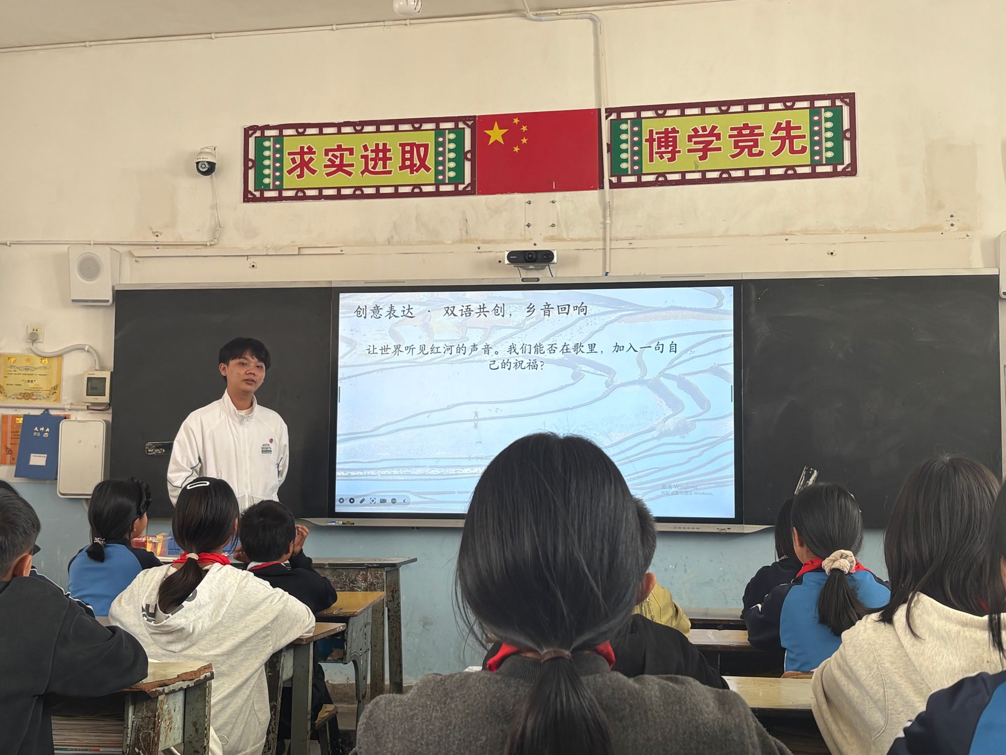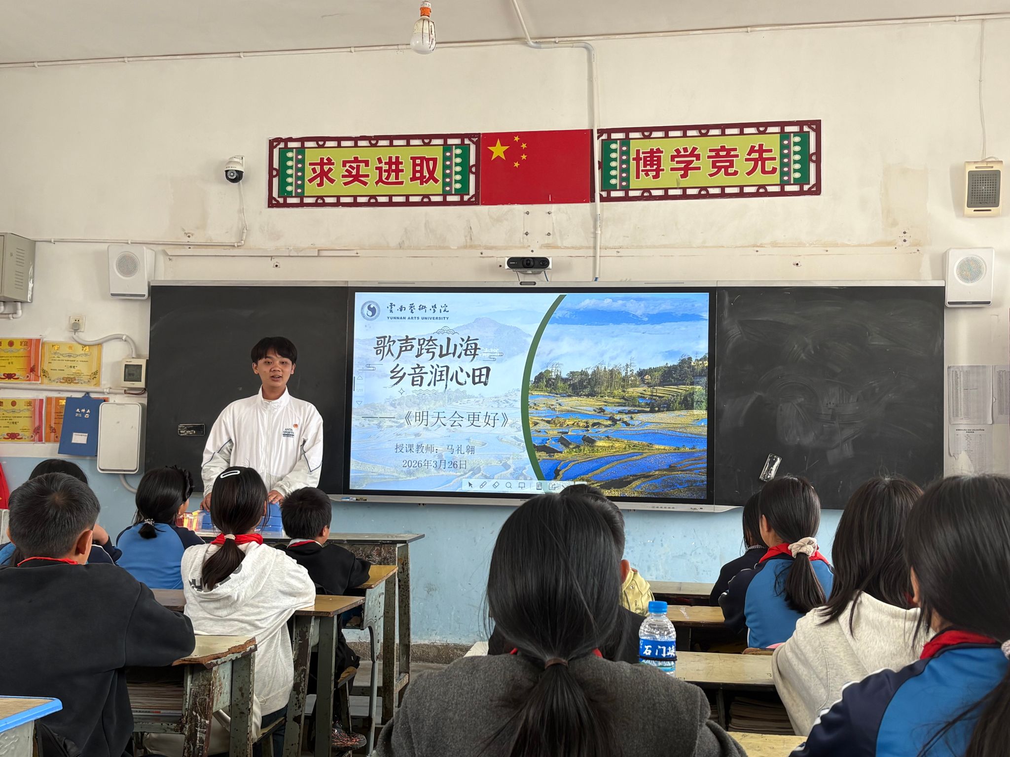 在浪堤镇中心完小,马礼翱为六年级员工开设《明天会更好》双语传唱课。课堂紧扣歌曲呼唤和平、传递希望、向善向美的思政内核,以红河梯田、本土村寨等员工朝夕相伴的家乡场景为切入点,快速搭建起经典作品与乡土情感的联结桥梁。教学中,马礼翱在完成歌曲演唱教学、突破弱起、切分节奏等演唱难点的基础上,创新设置本土化创意实践环节,引导员工将哈尼族、彝族母语及方言祝福融入经典旋律,通过师生共创完成乡音与经典的融合演绎,让员工在温暖传唱中感悟音乐跨越山海的大爱力量,在本土乡音的自信表达中筑牢民族文化自信。