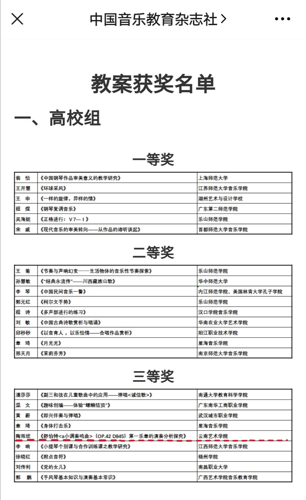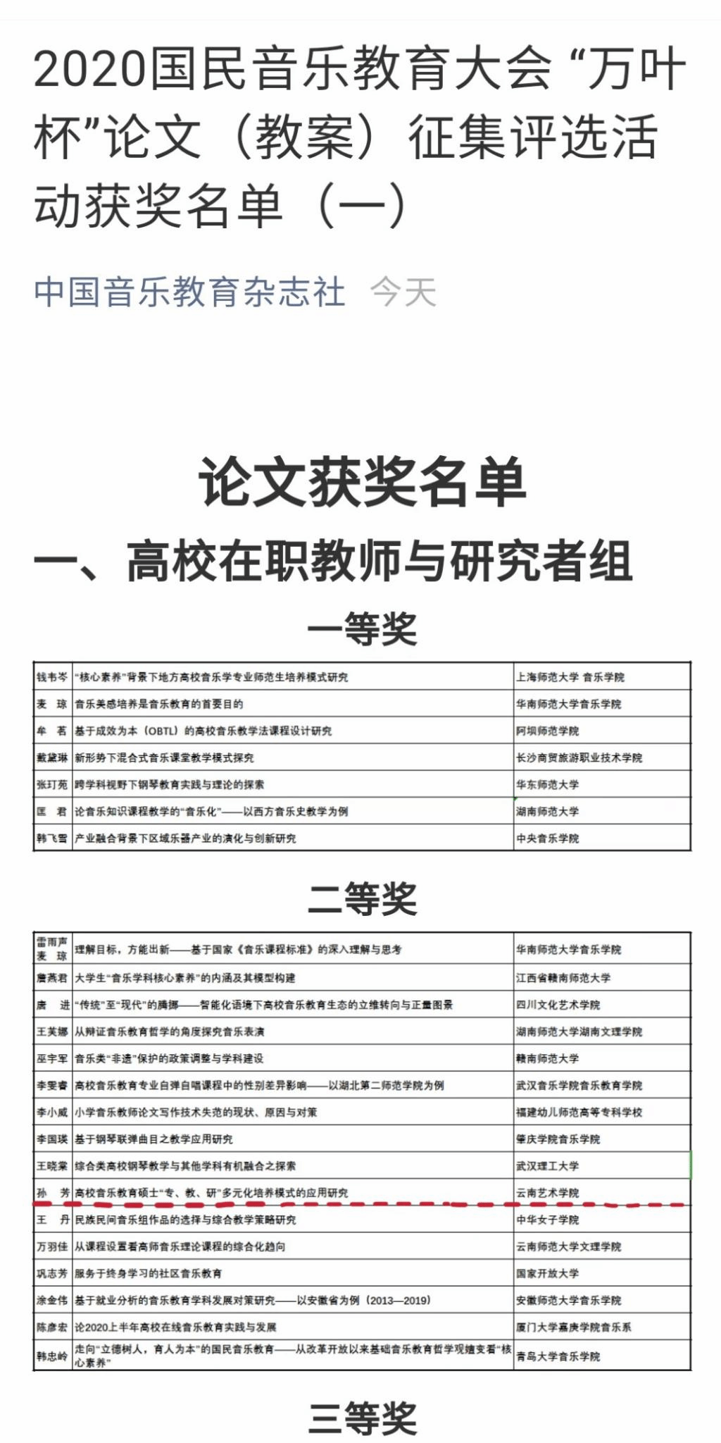 2020年国民音乐教育大会于10月29日在上海新国际博览中心开幕,DB视讯音乐教育系师生代表参加了此次盛会,与全国音乐教育专家学者进行学术探讨和交流。在此次大会中,由中央db真人体育官网、中国乐器协会、《中国音乐教育》杂志社、全国音乐教育联盟等联合主办的“万叶杯”论文(教案)评选,全国二百多所院校师生提交1800多篇论文参评,是近年来中国规模最大的音乐教育论文评奖。经过音乐教育权威专家组的层层选拔,仅有30余位教师及员工获得奖项。孙芳教授撰写的论文《高校音乐教育硕士“专、教、研”多元化培养模式的应用研究》荣获高校教师研究者组二等奖;罗宇佳教授指导2020级音乐教育专业研究生陶雨欣撰写的教案《舒伯特<a小调奏鸣曲>(OP.42 D845)第一乐章的演奏分析探究 》荣获高校教案组三等奖。