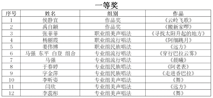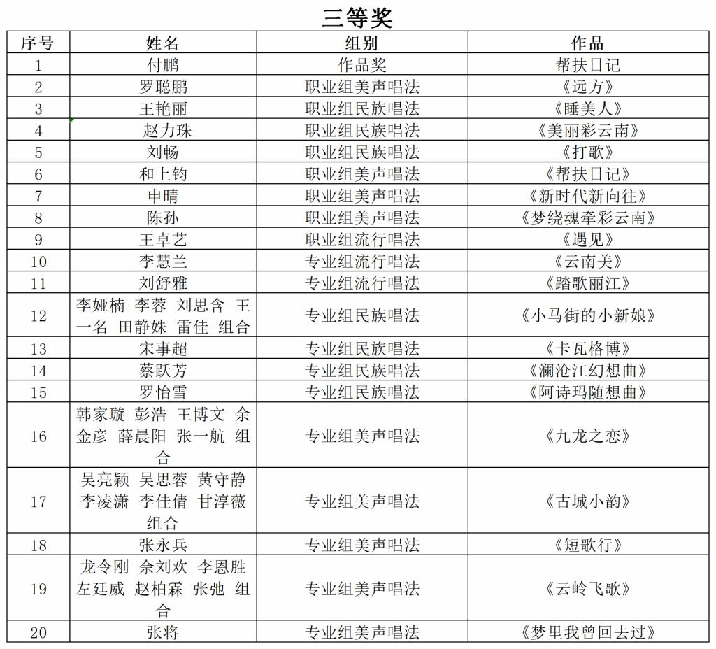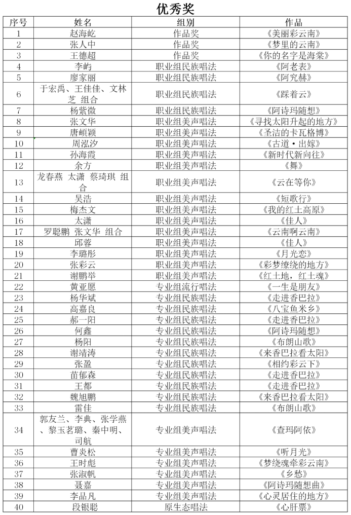 特别贡献奖1个(吴渝林、业原作曲《阿诗玛随想曲》)、作品类一等奖2个、职业组美声唱法一等奖1个、职业组流行唱法一等奖1个、职业组民族唱法一等奖1个、专业组流行唱法一等奖2个、专业组民族唱法一等奖2个、专业组美声唱法一等奖3个、作品类二等奖2个、职业组美声唱法二等奖2个、原生态唱法二等奖1个、专业组流行唱法二等奖3个、专业组民族唱法二等奖5个、专业组美声唱法二等奖4个、作品类三等奖1个、职业组美声唱法三等奖4个、职业组民族唱法三等奖3个、职业组流行唱法三等奖1个、专业组流行唱法三等奖2个、专业组民族唱法三等奖4个、专业组美声唱法三等奖5个、作品类优秀奖3个、职业组民族唱法优秀奖4个、职业组美声唱法优秀奖14个、专业组流行唱法优秀奖1个、专业组民族唱法优秀奖11个、专业组美声唱法优秀奖6个、原生态唱法优秀奖1个。