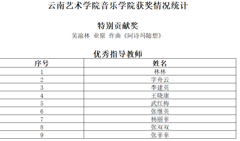 db真人体育官网代表队先后摘得第六届云南本土歌曲创作暨展演活动1个特别贡献奖、12个一等奖、17个二等奖、20个三等奖、40个优秀奖以及9个优秀指导教师奖: