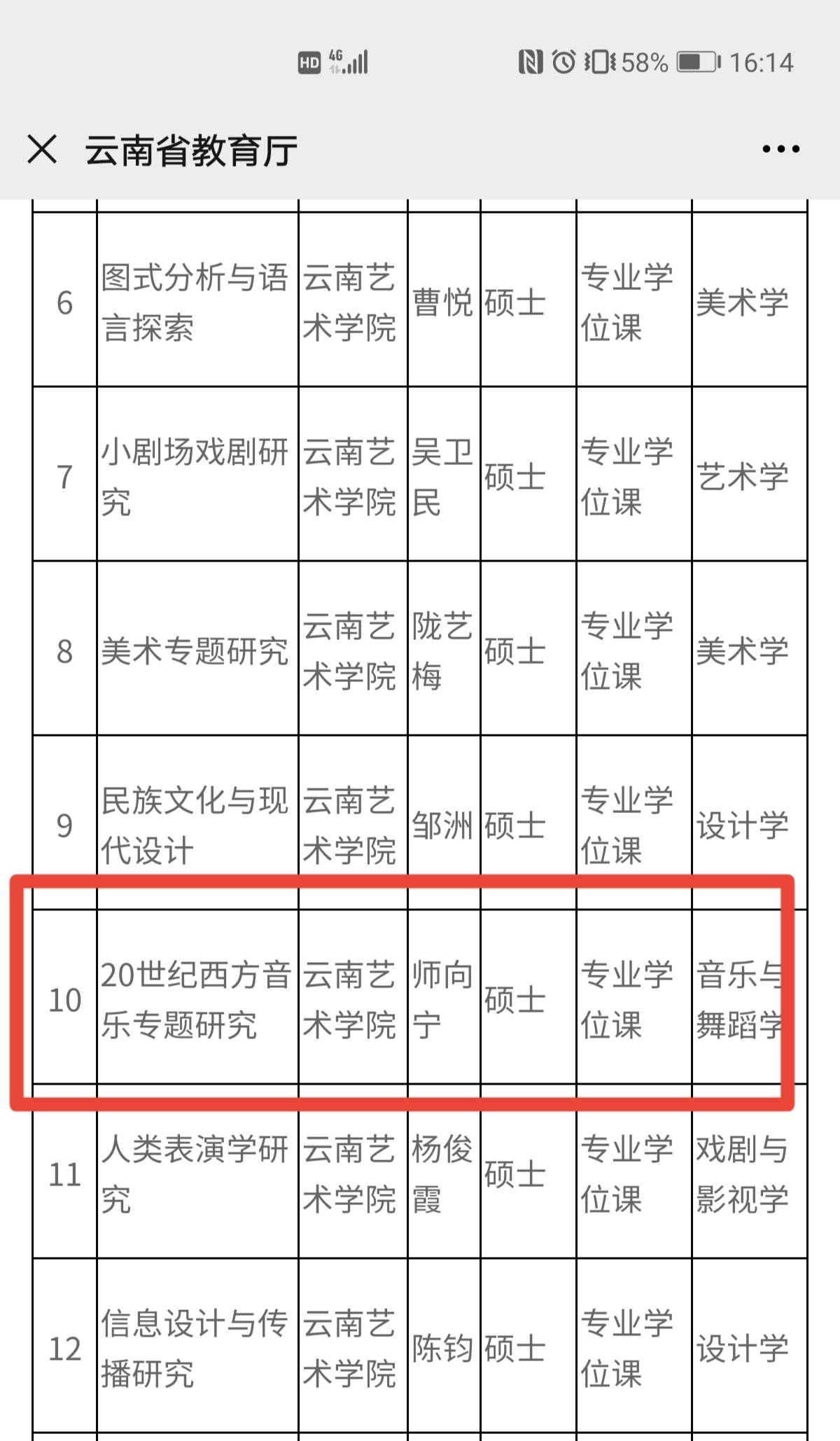 由db真人体育官网副经理师向宁教授主持申报的硕士研究生专业学位课程《20世纪西方音乐专题研究》获得2020年度云南省研究生优质课程立项。
