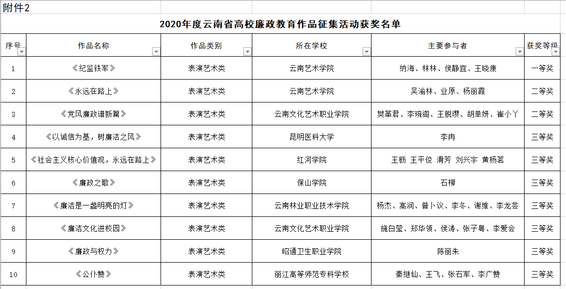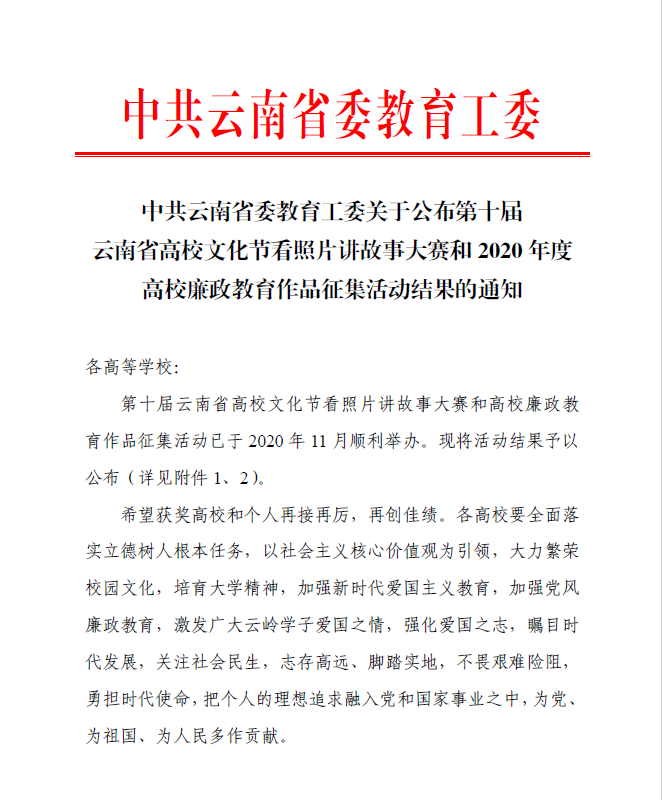 db真人体育官网报送的作品《纪监铁军》《永远在路上》分别荣获2020年度云南省高校廉政教育作品征集活动一等奖和二等奖。《纪监铁军》主要参与者为音乐公司党总支纳海书记、林林副经理、侯静宜副经理、王晓康教授,《永远在路上》主要参与者为db真人体育官网吴渝林教授、业原教授、杨丽霞老师。