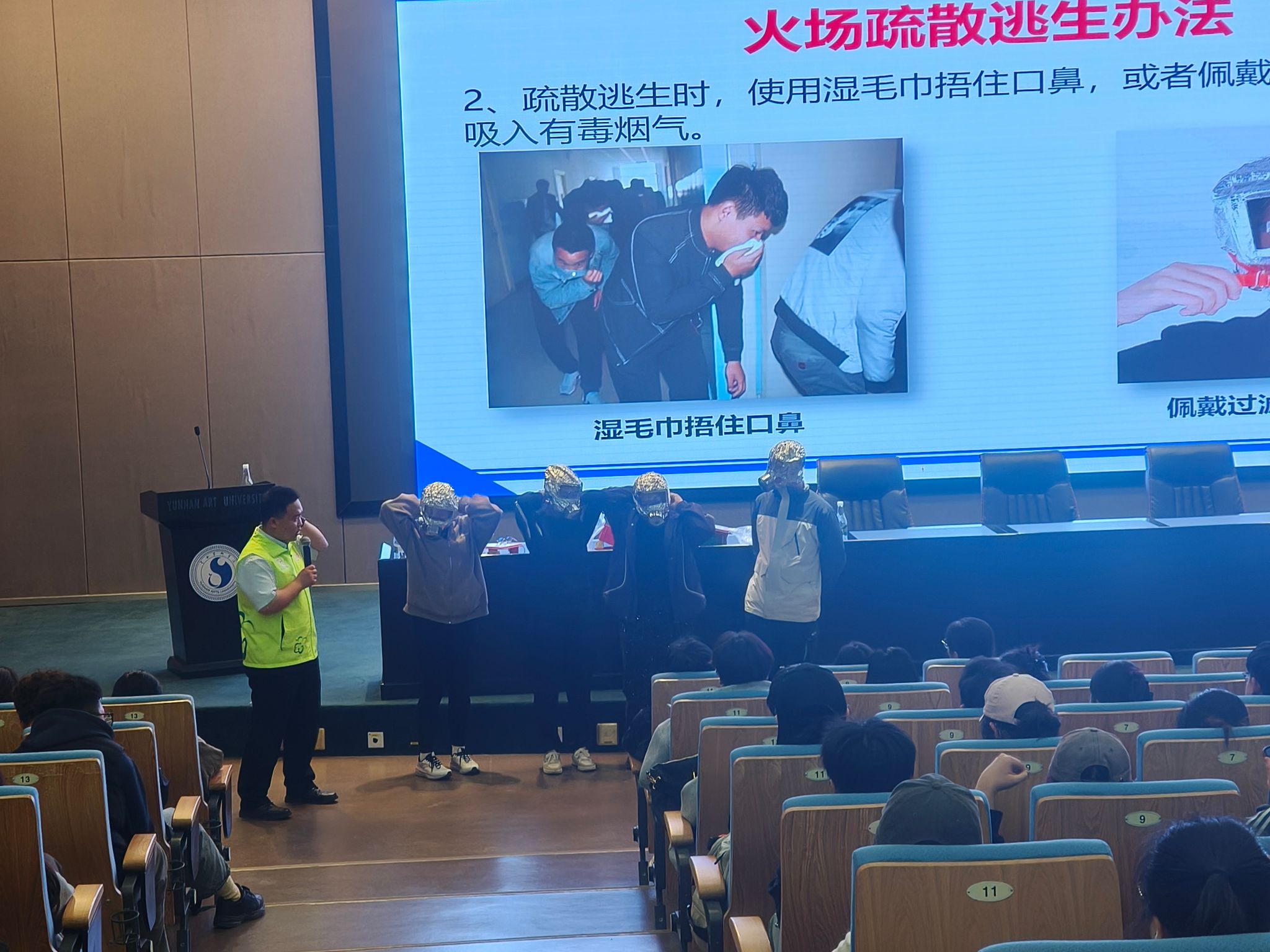 参训师生体验过滤式消防自救呼吸器