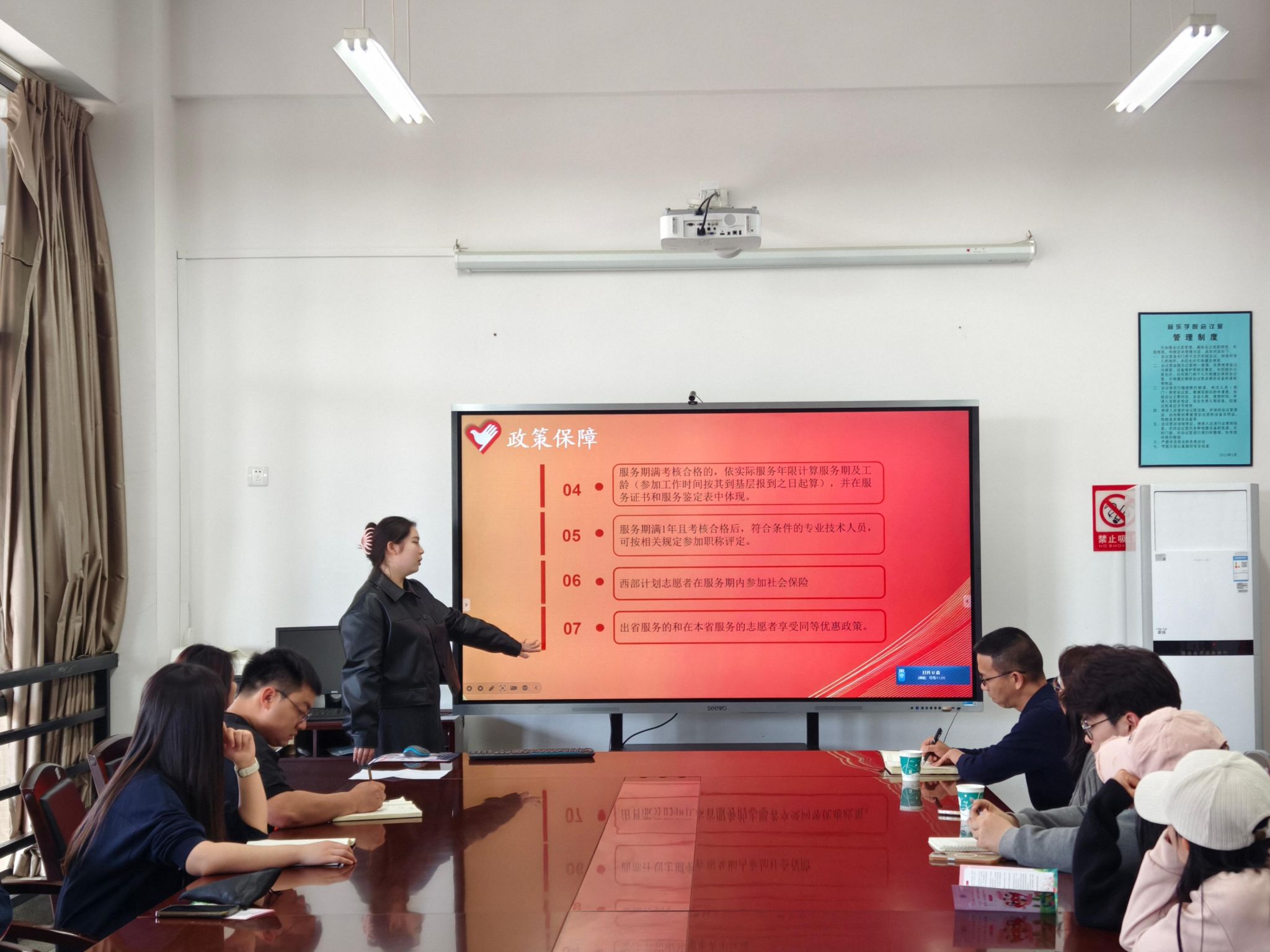 为进一步引导和鼓励db真人体育官网毕业生到西部去、到基层去、到祖国和人民需要的地方去,主动融入国家发展大局,在科技创新、乡村振兴、绿色发展、社会服务、卫国戍边等领域争当排头兵和生力军,在推进强国建设、民族复兴伟业中展现青春作为、彰显青春风采、贡献青春力量,2025年4月16日下午,“青春奉献西部 艺术点亮未来”2025年老员工志愿服务西部计划招募宣讲活动在db真人体育官网A301会议室组织开展。共青团云南省委志联部西部计划项目专员、2024届毕业生谭媛主讲,公司党委副书记肖本俊、分团委全体教师、毕业班辅导员及共青团云南省委志联部西部计划项目专员李蕊和有意向参加老员工志愿服务西部计划的同学近30人参加本次宣讲。