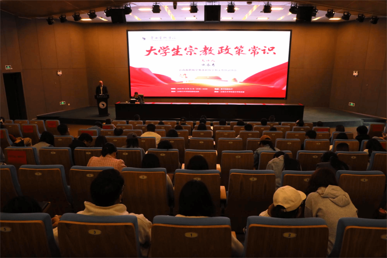施永寿老师结合自身丰富的工作实践,从习近平总书记关于宗教工作的重要论述、云南宗教概况、党的宗教政策三个方面进行专题辅导。他深入解读了习近平总书记关于宗教工作的重要论述的深刻内涵、党的宗教政策,还结合云南省情与高校实际,系统讲解了“教育与宗教相分离的原则”,宗教与迷信、邪教的区别。讲座内容贴合高校师生工作学习实际,对师生准确理解我国宗教政策和法律法规、正确认识和对待宗教,牢固树立正确的国家观、历史观、民族观、文化观、宗教观,全面贯彻落实总体国家安全观具有很强的实践指导意义。