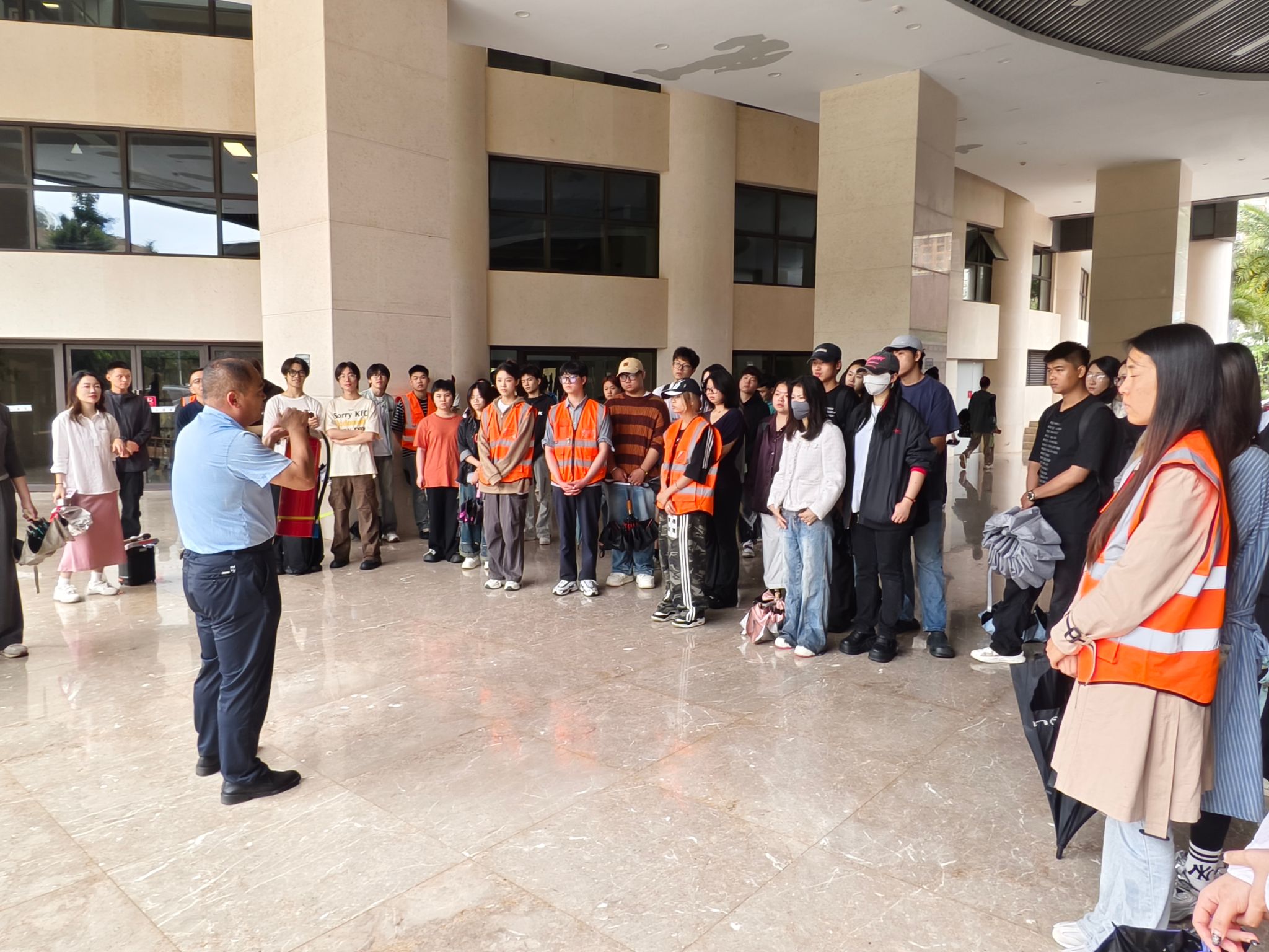 本次演练分为两个阶段,第一阶段在员工宿舍3栋模拟失火疏散演练。当火灾警报声骤然响起,同学们迅速按照预定疏散路线,弯腰、捂鼻、贴墙,快速、安全、有序撤离至安全区域。第二阶段在图书馆前进行消防知识培训和灭火演练。保卫处相关负责老师现场演示了灭火器和消火栓的使用方法,详细讲解了灭火器“提、拔、握、压”四步操作要领,以及消火栓“开箱、铺带、接阀、出水”等关键步骤。